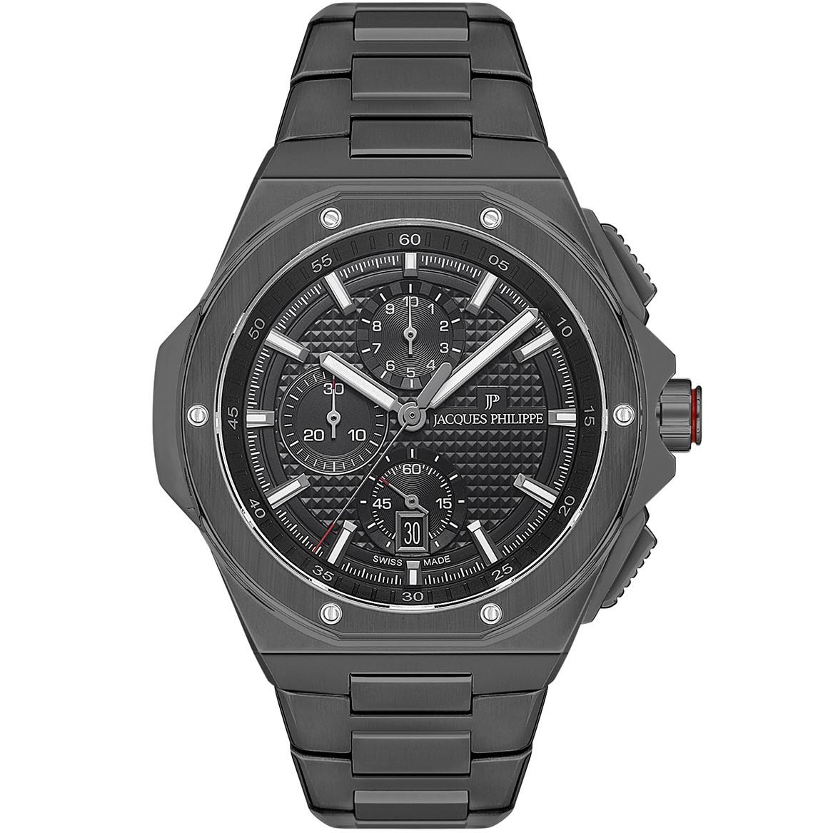 ساعت مچی مردانه ژاک فیلیپ jacques philippe با طراحی روزانه بند فلزی دودی و قاب گرد دودی و صفحه گرد مشکی با شیشه ضد خراش و قابلیت داشتن تقویم / شبنما / کرنوگراف با موتور سوییسی و انرژی باتری و مقاوم در برابر آب تا عمق 50 متر به همراه گارانتی بین المللی