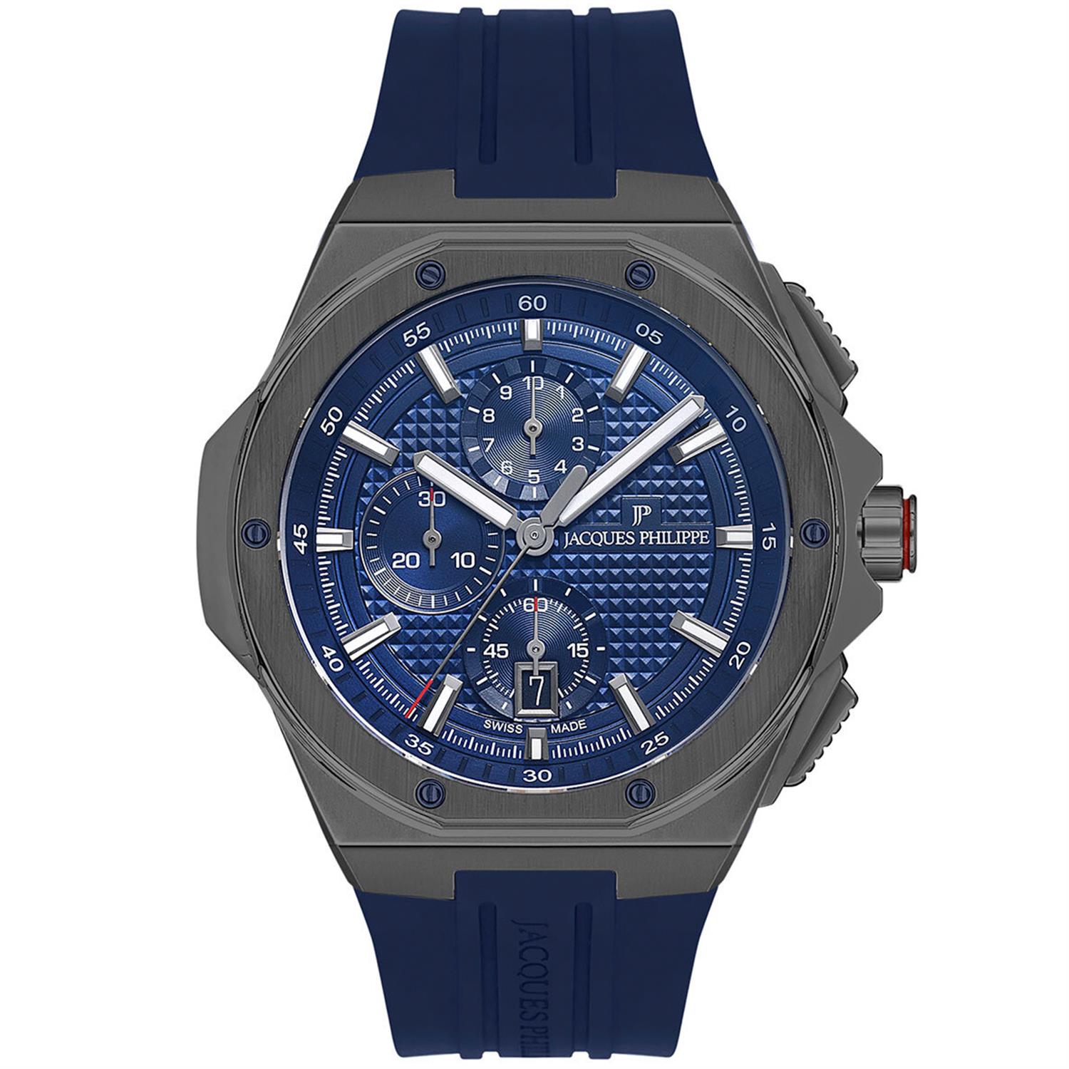 ساعت مچی مردانه ژاک فیلیپ jacques philippe با طراحی روزانه بند سیلیکونی سرمه ای و قاب متفاوت طوسی و صفحه گرد سرمه ای با شیشه ضد خراش و قابلیت داشتن تقویم / شبنما / کرنوگراف با موتور سوییسی و انرژی باتری و مقاوم در برابر آب تا عمق 50 متر به همراه گارانتی بین المللی