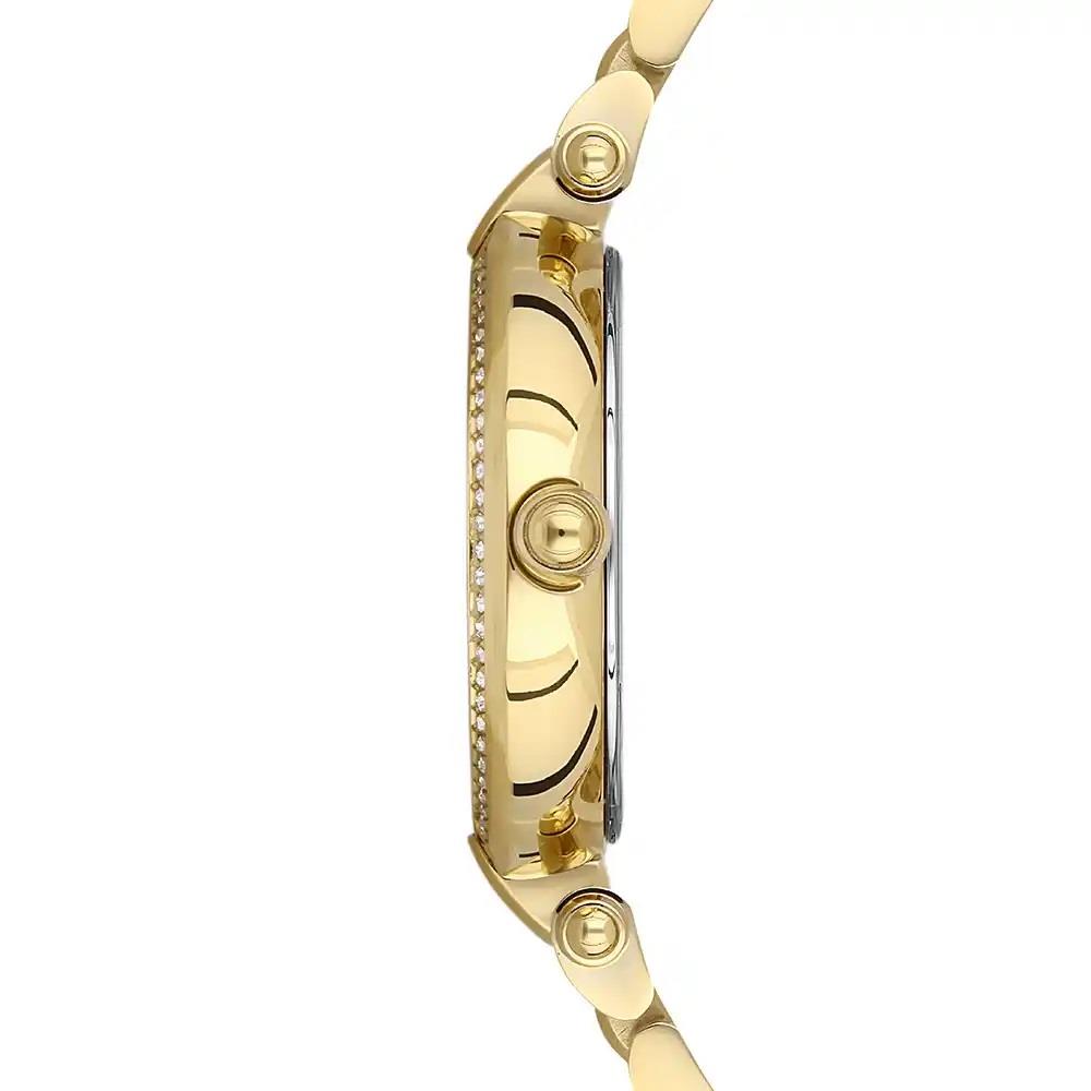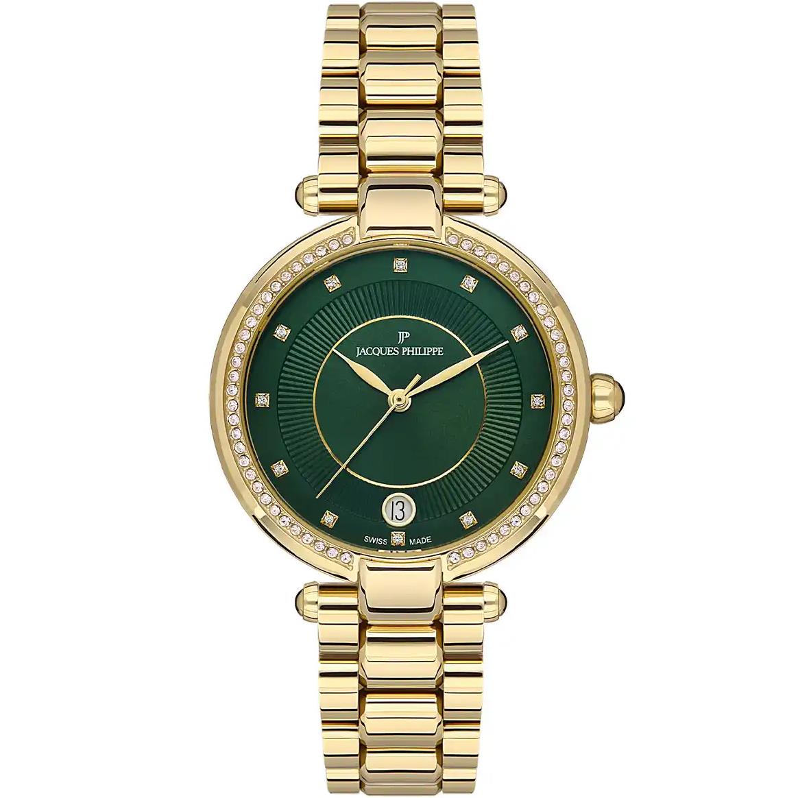 ساعت مچی زنانه ژاک فیلیپ jacques philippe با طراحی کلاسیک بند فلزی طلایی و قاب دور نگین طلایی , صفحه مزین به نگین سبز با شیشه ضد خراش و قابلیت داشتن تقویم با موتور سوییسی و انرژی باتری و مقاوم در برابر آب تا عمق 50 متر به همراه گارانتی بین المللی