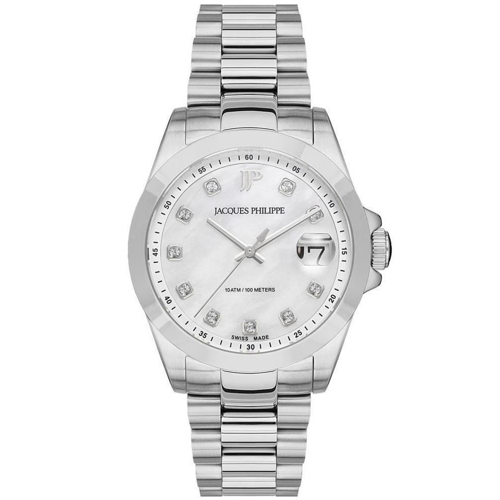 ساعت مچی زنانه ژاک فیلیپ jacques philippe با طراحی کلاسیک بند استیل و قاب گرد استیل , صفحه نگین دار سفید با شیشه ضد خراش و قابلیت داشتن تقویم با موتور سوییسی و انرژی باتری و مقاوم در برابر آب تا عمق 100 متر به همراه گارانتی بین المللی
