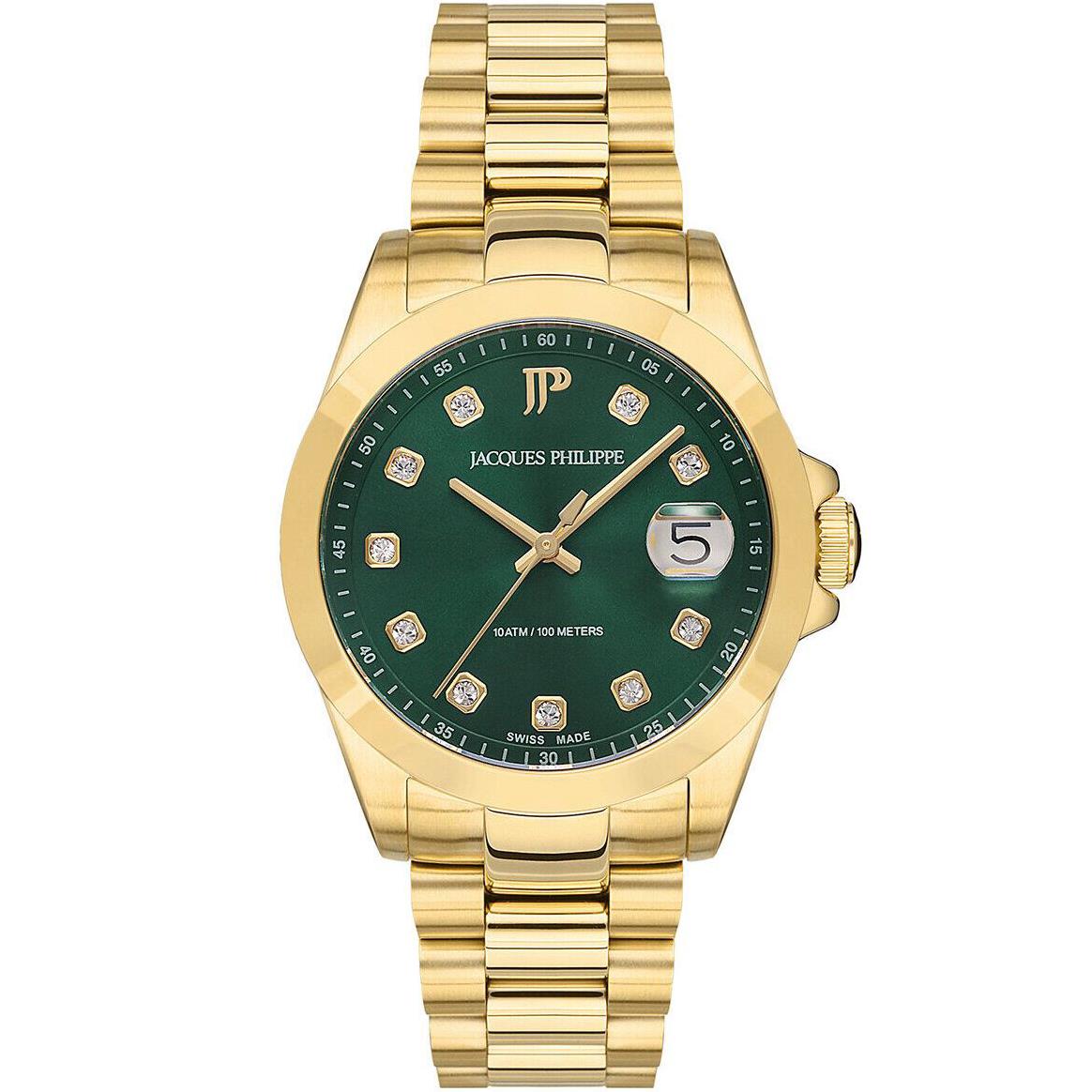 ساعت مچی زنانه ژاک فیلیپ jacques philippe با طراحی کلاسیک بند طلایی و قاب گرد طلایی , صفحه نگین دار سبز با شیشه ضد خراش و قابلیت داشتن تقویم با موتور سوییسی و انرژی باتری و مقاوم در برابر آب تا عمق 100 متر به همراه گارانتی بین المللی