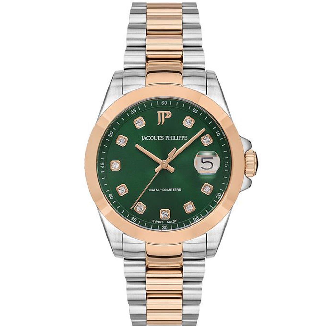 ساعت مچی زنانه ژاک فیلیپ jacques philippe با طراحی کلاسیک بند استیل مسی و قاب گرد مسی استیل, صفحه نگین دار سبز با شیشه ضد خراش و قابلیت داشتن تقویم با موتور سوییسی و انرژی باتری و مقاوم در برابر آب تا عمق 100 متر به همراه گارانتی بین المللی