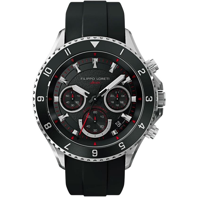 ساعت مچی مردانه فیلیپو لورتی filippoloreti با طراحی اسپرت بند سیلیکونی مشکی و قاب گرد دو رنگ و صفحه گرد مشکی با  قابلیت داشتن تقویم / کرنوگراف / شب نما / زه چرخان و موتور ژاپنی با انرژی باتری و مقاوم در برابر آب تا عمق 100 متر به همراه گارانتی بین المللی
