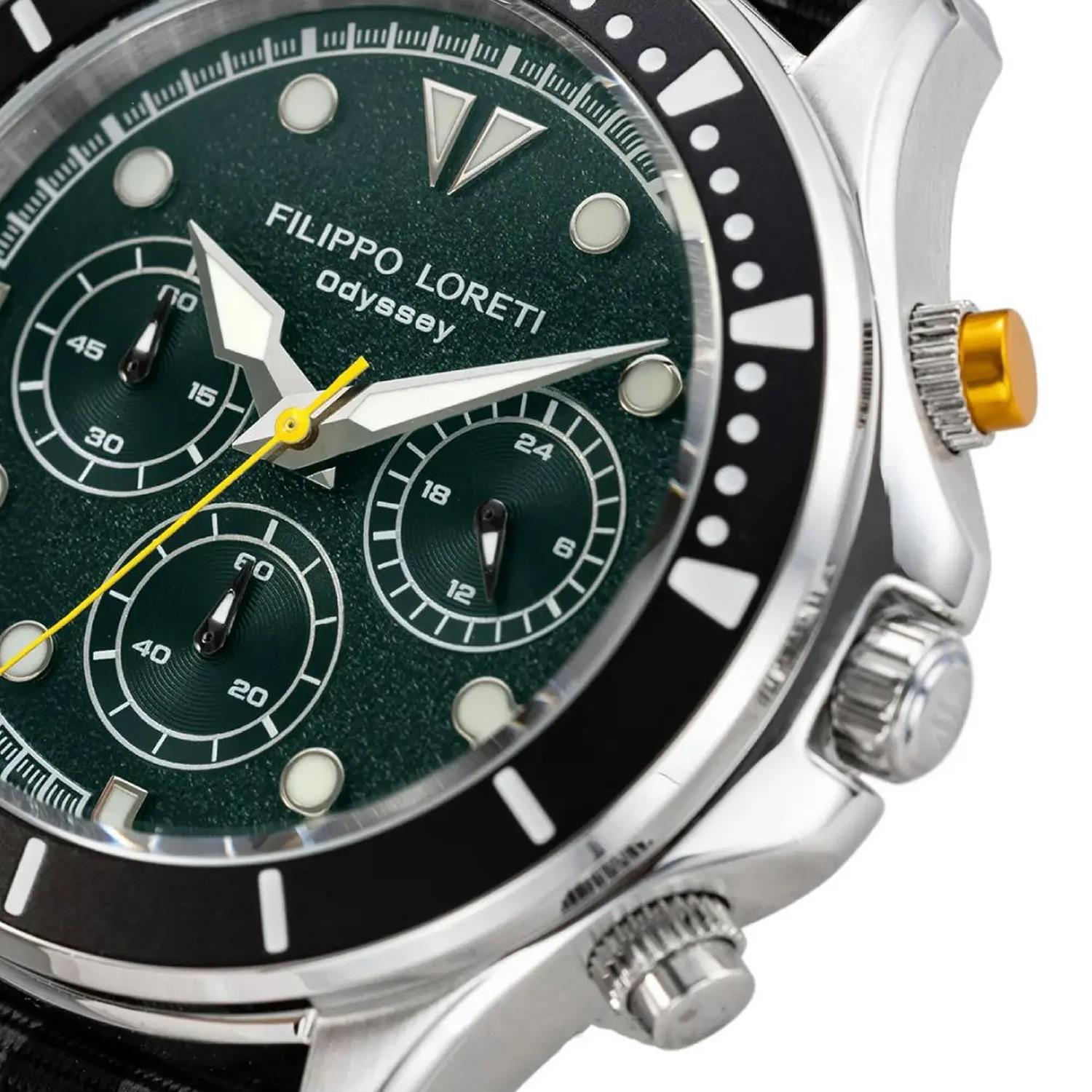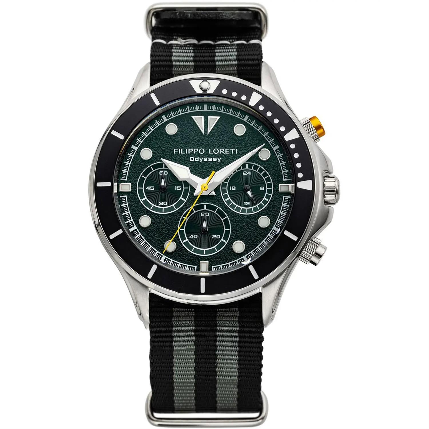 ساعت مچی مردانه فیلیپو لورتی filippoloreti با طراحی روزلنه بند برزنتی مشکی طوسی و قاب گرد فلزی مشکی و صفحه گرد سبز با شیشه ضد خراش و قابلیت داشتن کرنوگراف / شب نما / روزوشب و موتور ژاپنی با انرژی باتری و مقاوم در برابر آب تا عمق 100 متر به همراه گارانتی بین المللی