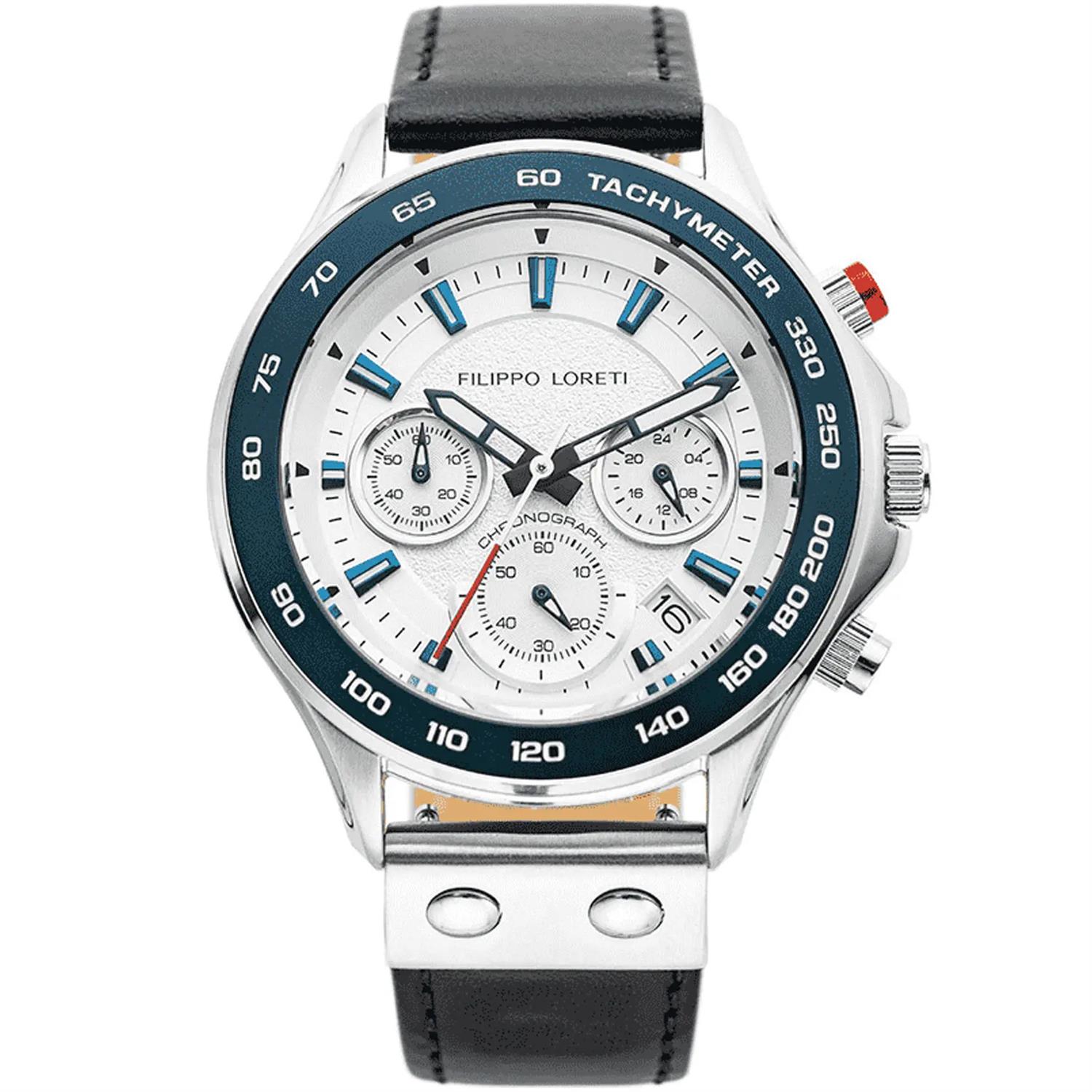 ساعت مچی مردانه فیلیپو لورتی filippoloreti با طراحی روزلنه بند چرمی و قاب گرد استیل سرمه ای و صفحه گرد سفید با شیشه ضد خراش و قابلیت داشتن کرنوگراف / شب نما / تقویم / زه تاچی متر/ روزوشب و موتور ژاپنی با انرژی باتری و مقاوم در برابر آب تا عمق 100 متر به همراه گارانتی بین المللی