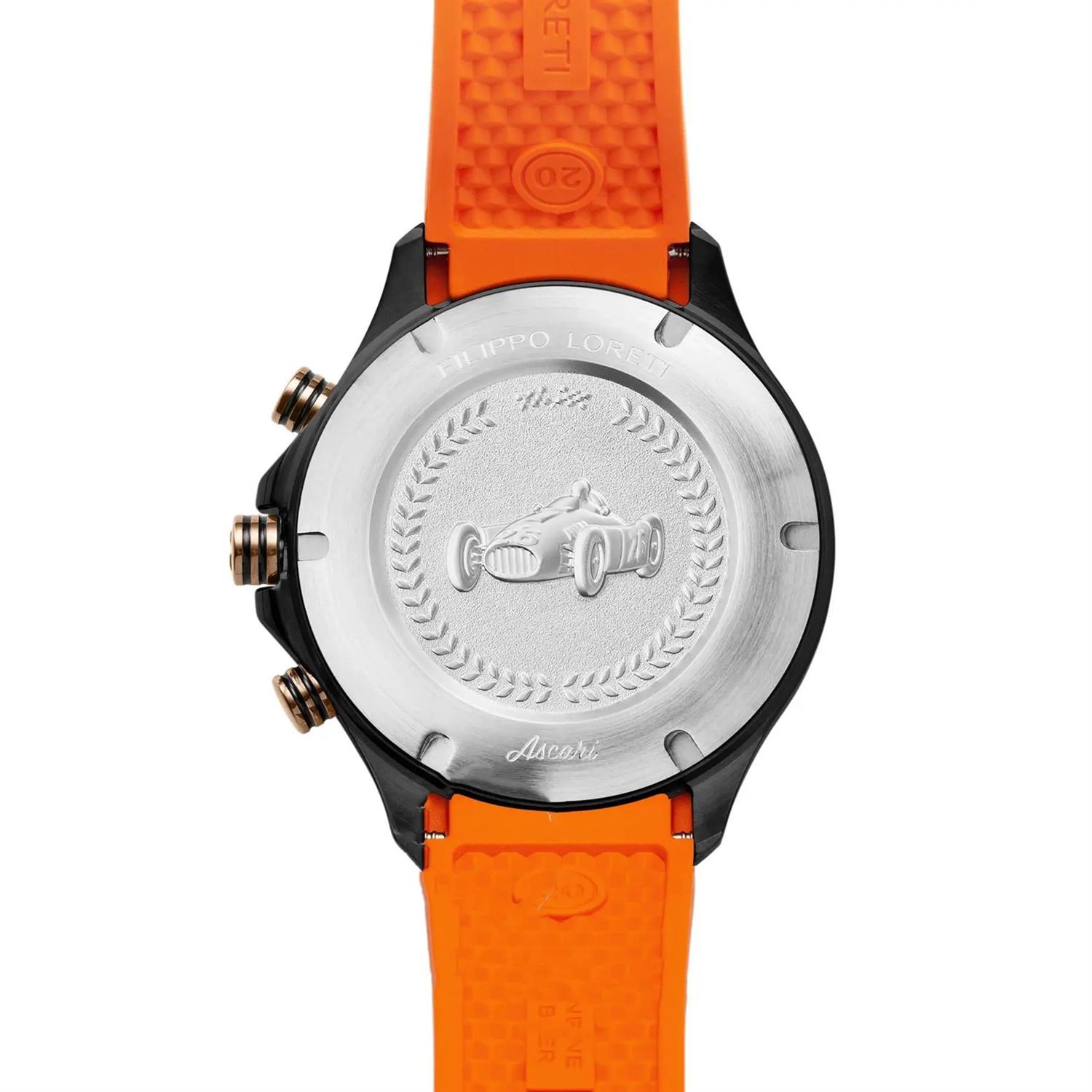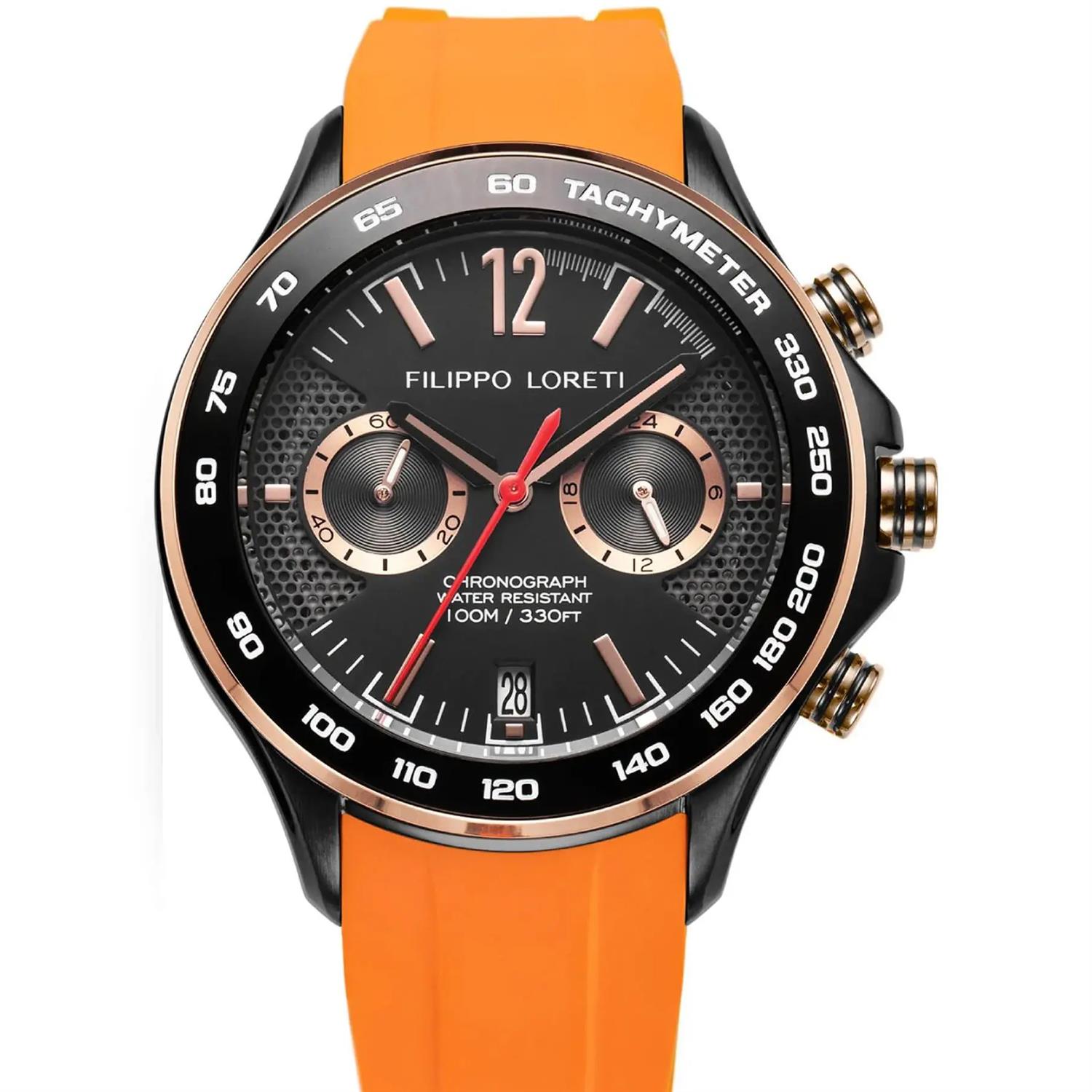 ساعت مچی مردانه فیلیپو لورتی filippoloreti با طراحی اسپرت بند سیلیکونی نارنجی و قاب گرد مشکی مسی و صفحه گرد مشکی با شیشه ضد خراش و قابلیت داشتن کرنوگراف / شب نما / تقویم / زه تاچی متر و موتور ژاپنی با انرژی باتری و مقاوم در برابر آب تا عمق 100 متر به همراه گارانتی بین المللی