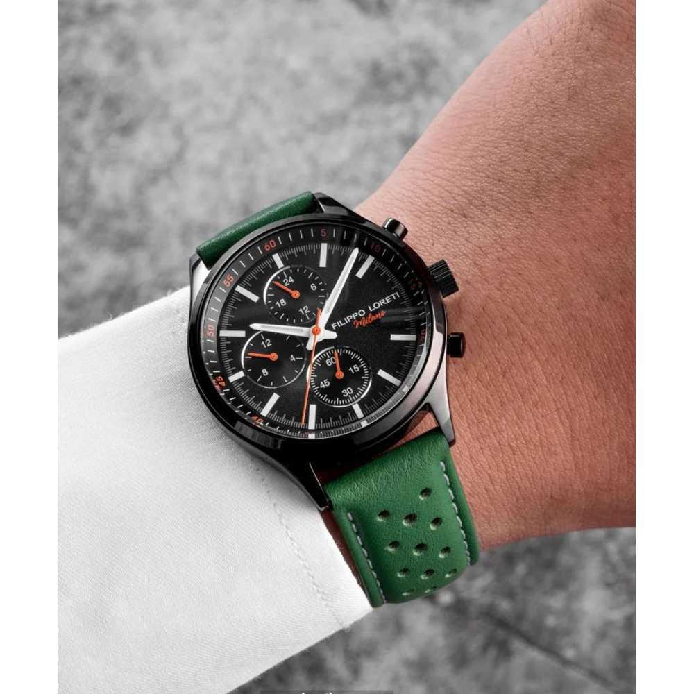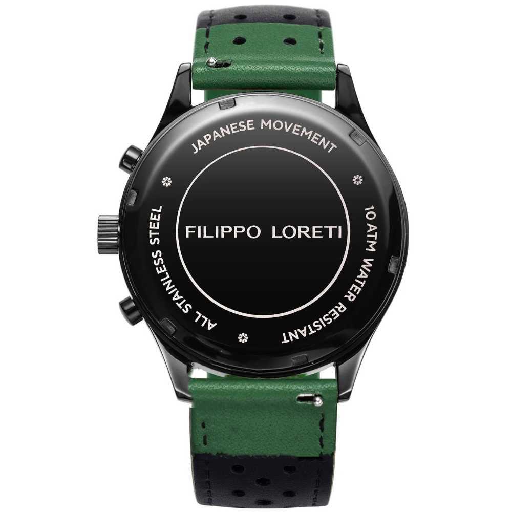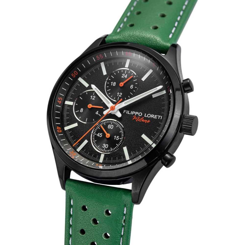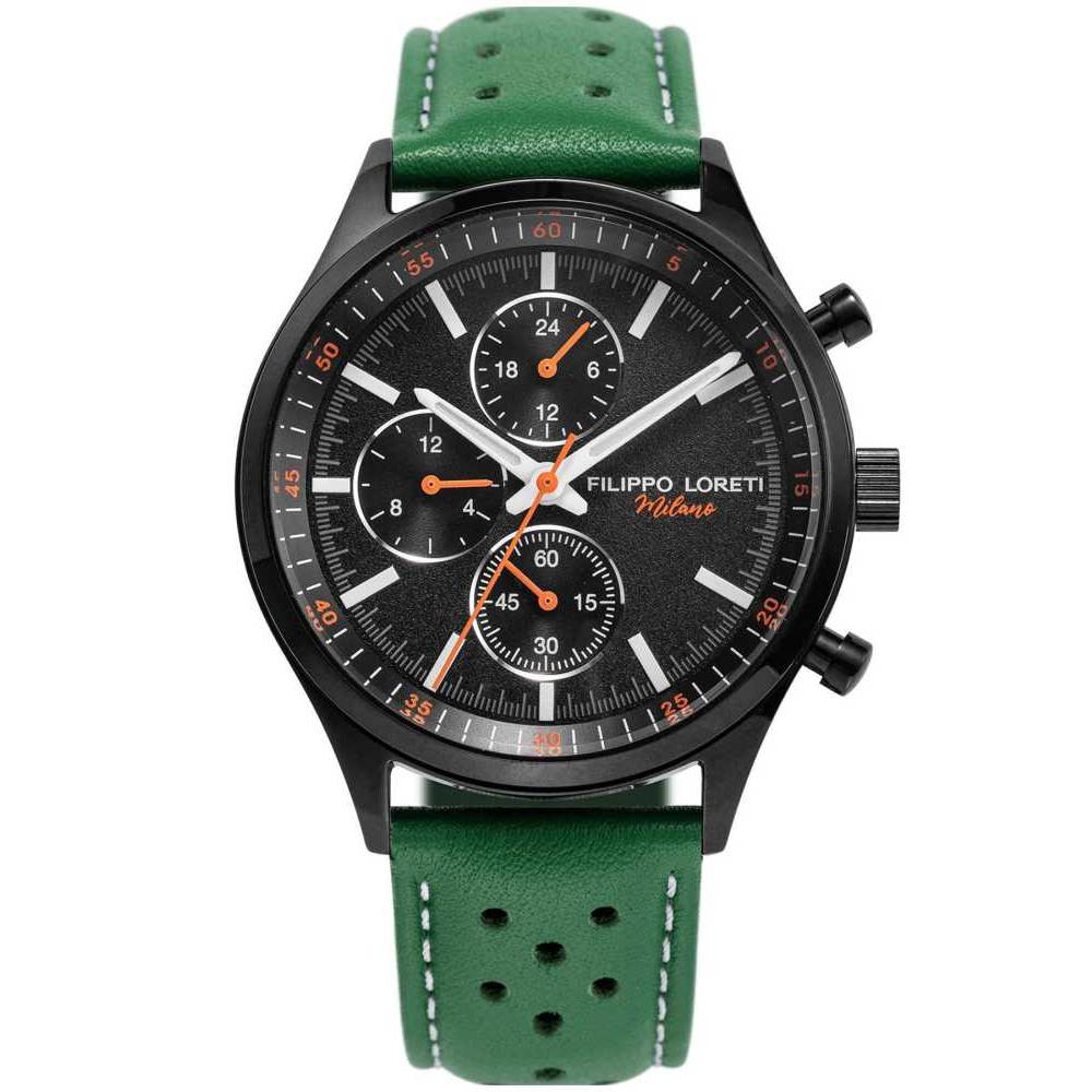 ساعت مچی مردانه فیلیپو لورتی filippoloreti با طراحی اسپرت بند چرمی سبز و قاب گرد مشکی و صفحه گرد مشکی و قابلیت داشتن کرنوگراف / روزوشب/ شب نما و موتور ژاپنی با انرژی باتری و مقاوم در برابر آب تا عمق 100 متر به همراه گارانتی بین المللی