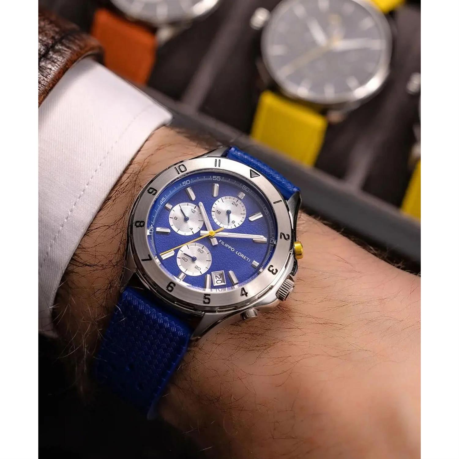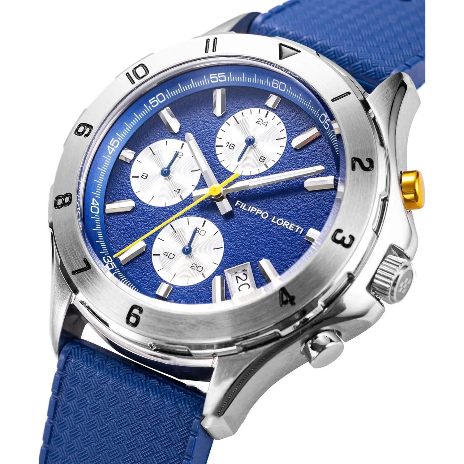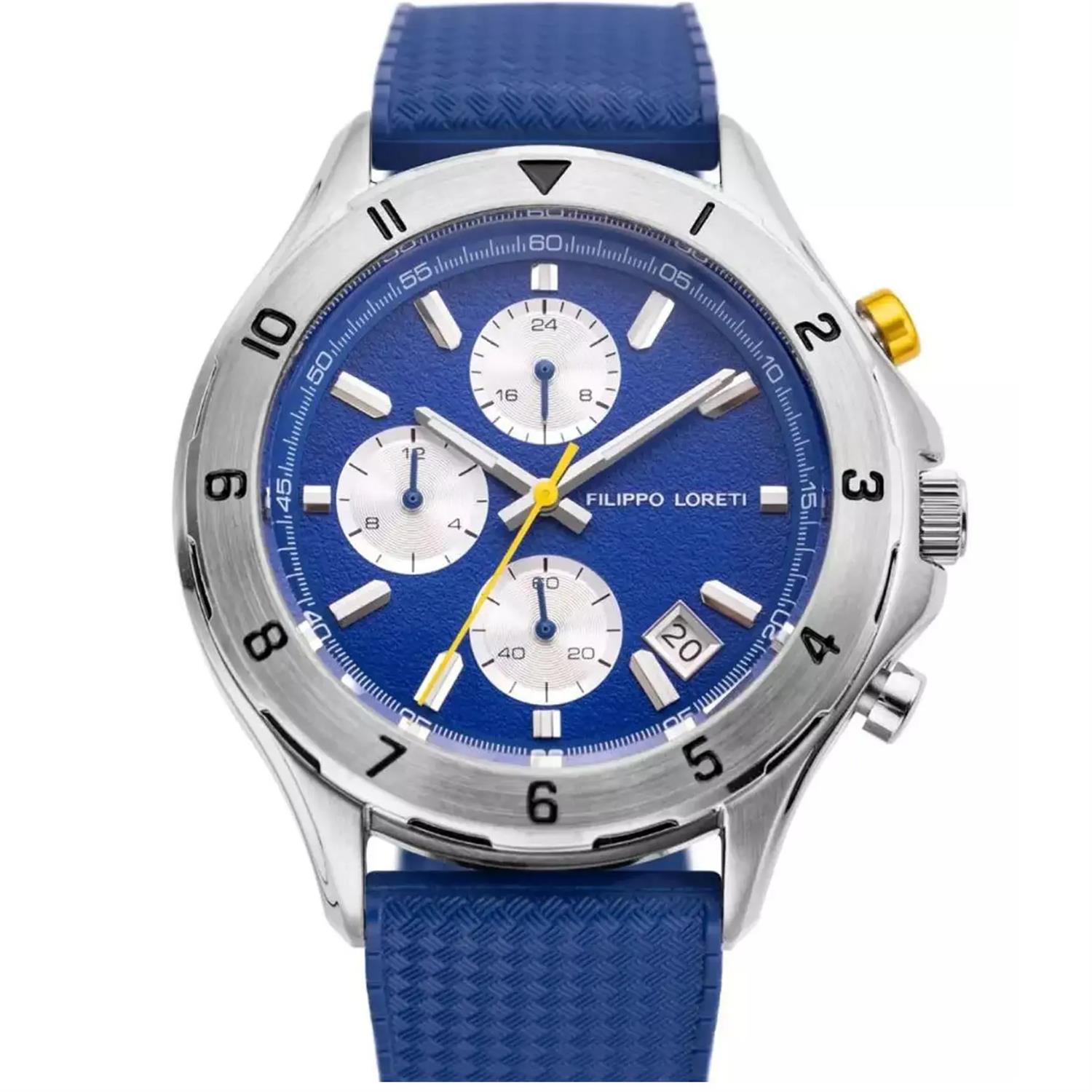 ساعت مچی مردانه فیلیپو لورتی filippoloreti با طراحی اسپرت بند سیلیکونی آبی و قاب گرد استیل و صفحه دو رنگ با شیشه ضد خراش و قابلیت داشتن کرنوگراف / تقویم/ شب نما  و موتور ژاپنی با انرژی باتری و مقاوم در برابر آب تا عمق 100 متر به همراه گارانتی بین المللی