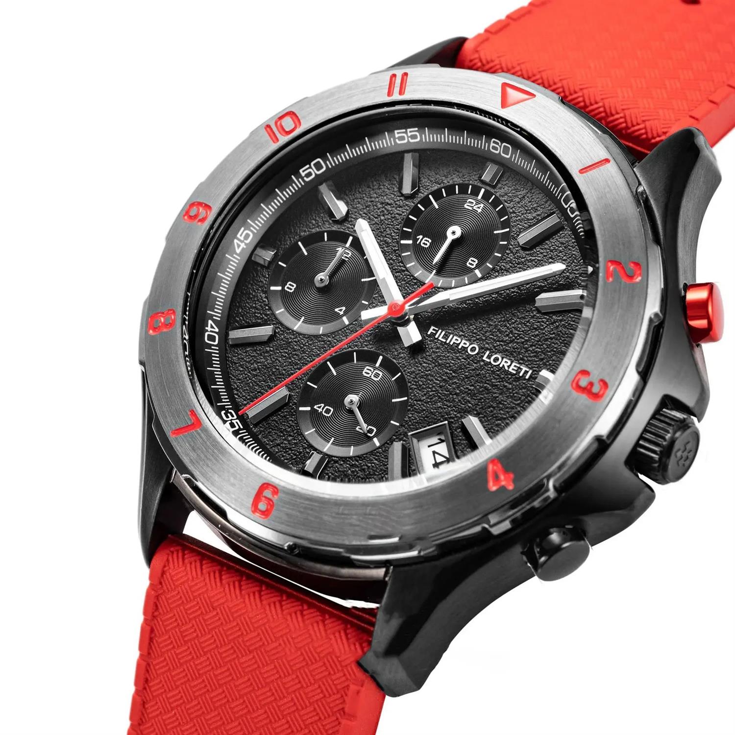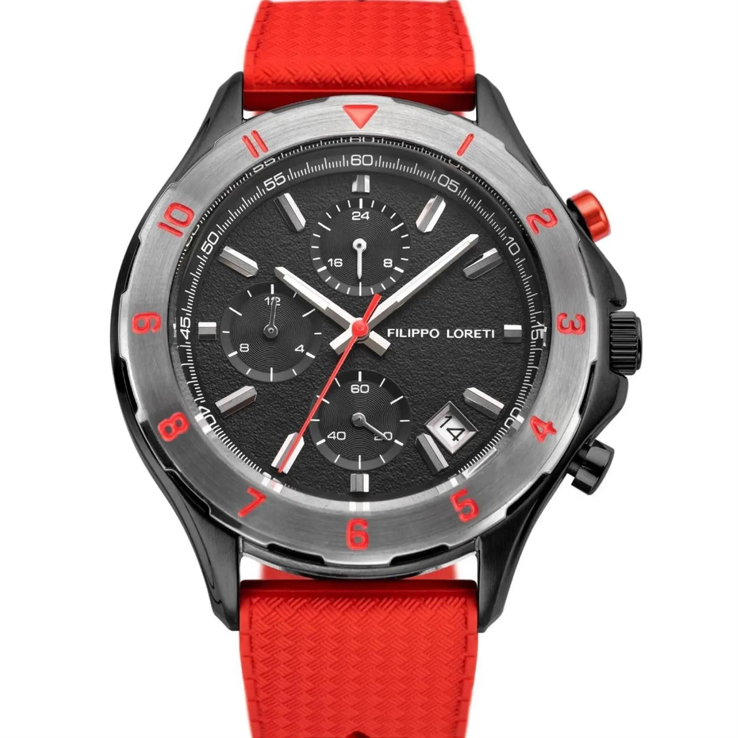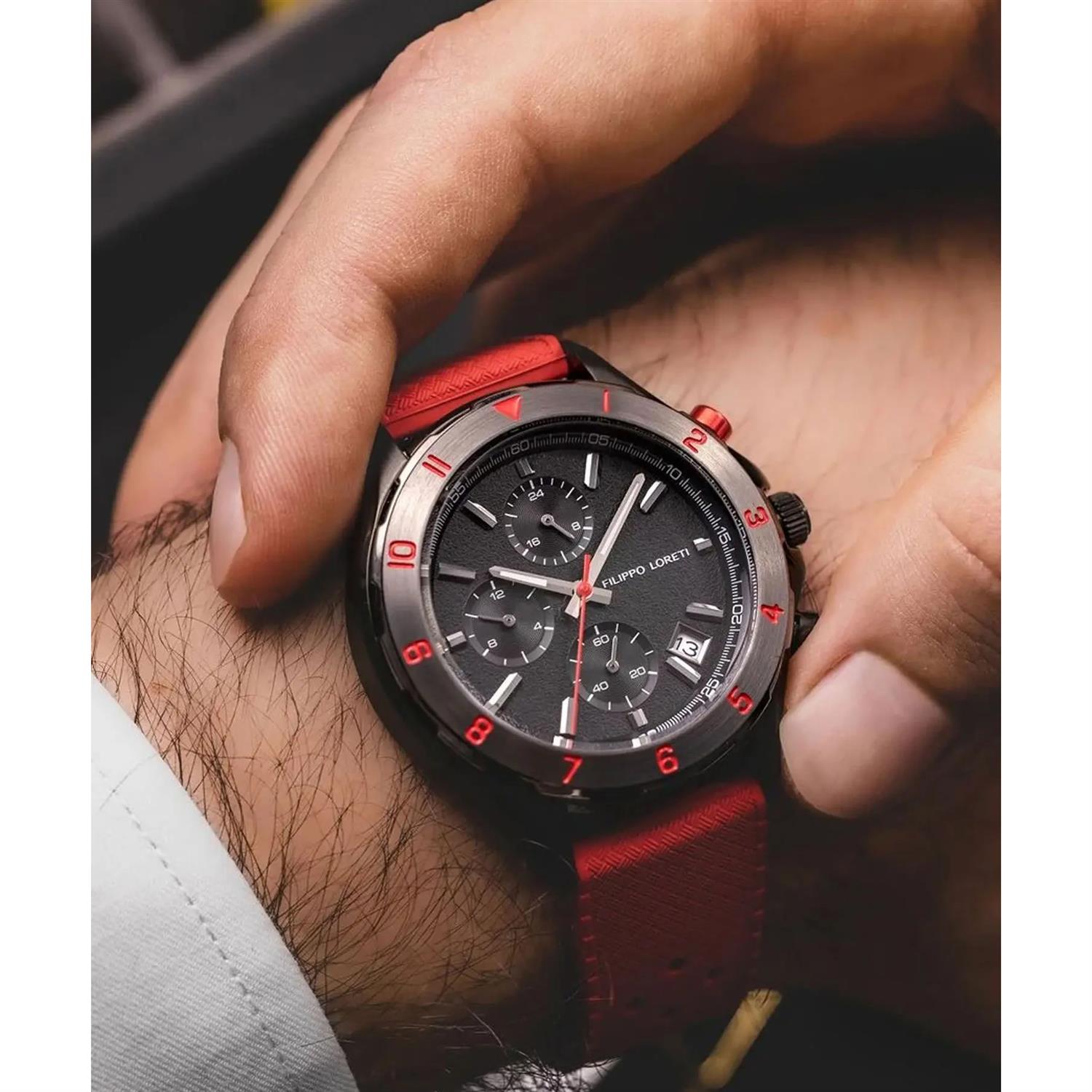 ساعت مچی مردانه فیلیپو لورتی filippoloreti با طراحی اسپرت بند سیلیکونی قرمز و قاب گرد دو رنگ  و صفحه گرد مشکی با شیشه ضد خراش و قابلیت داشتن کرنوگراف / تقویم/ شب نما و موتور ژاپنی با انرژی باتری و مقاوم در برابر آب تا عمق 100 متر به همراه گارانتی بین المللی
