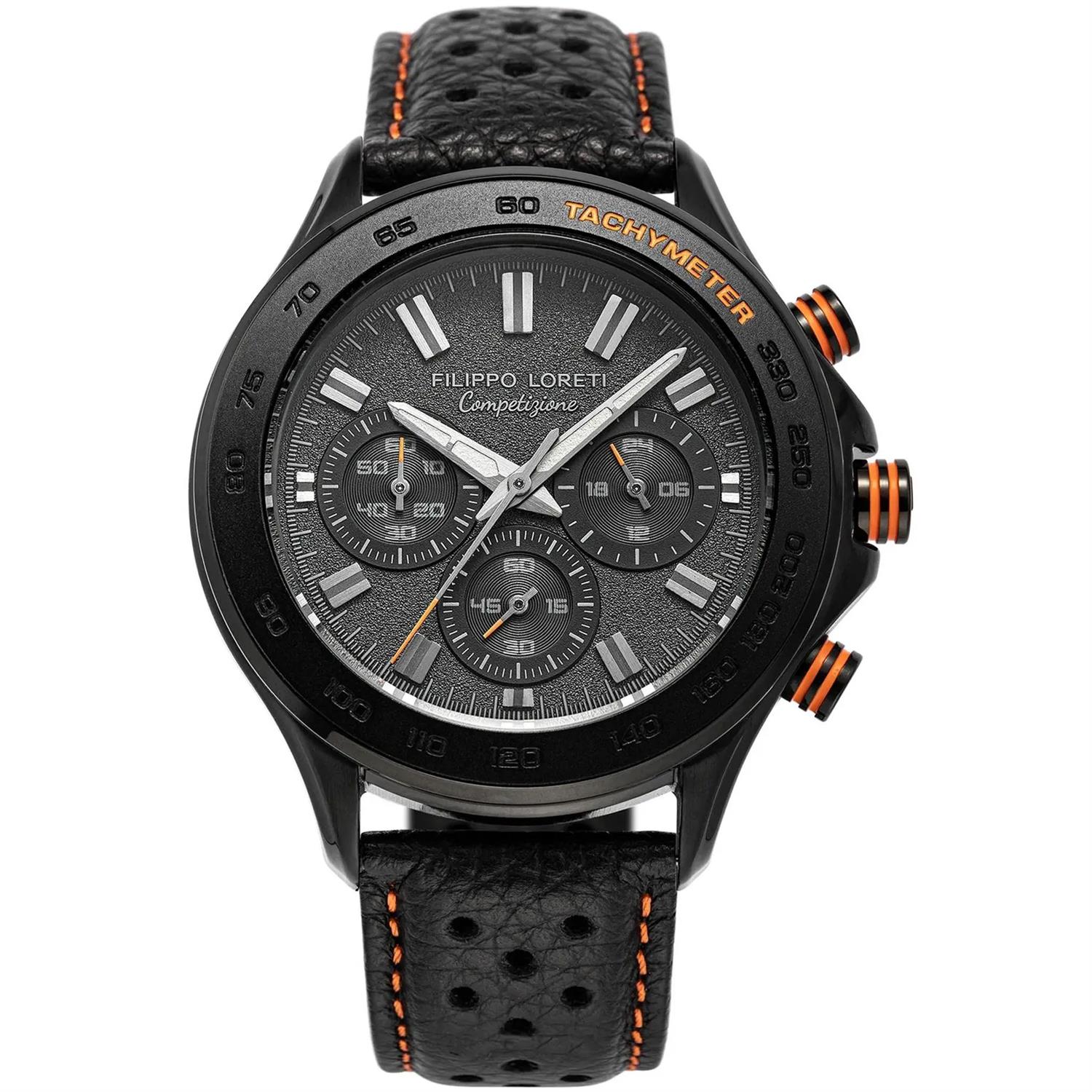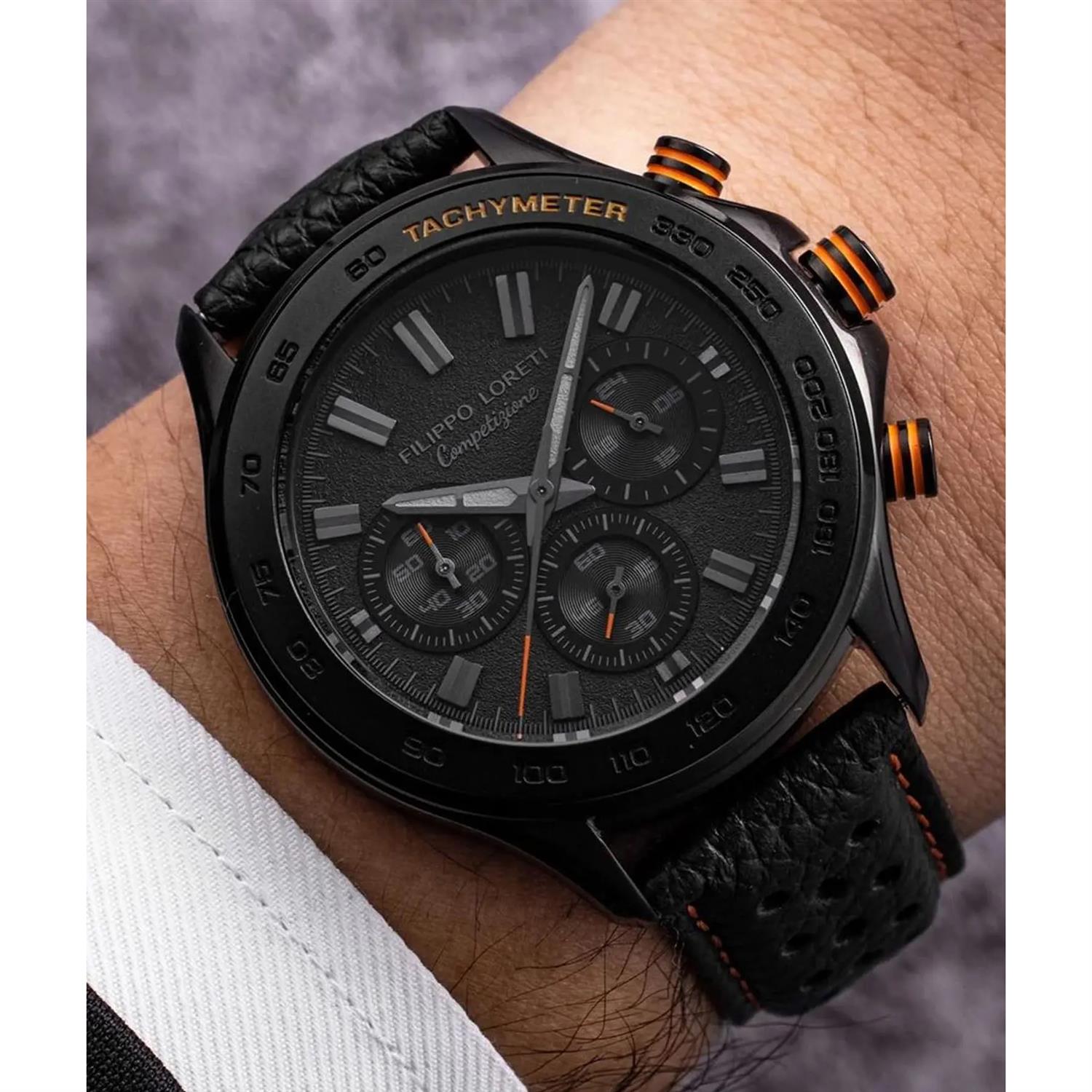 ساعت مچی مردانه فیلیپو لورتی filippoloreti با طراحی اسپرت بند چرمی مشکی و قاب گرد مشکی و صفحه گرد مشکی با شیشه ضد خراش و قابلیت داشتن کرنوگراف/ شب نما / زه تاچی متر و موتور ژاپنی با انرژی باتری و مقاوم در برابر آب تا عمق 100 متر به همراه گارانتی بین المللی