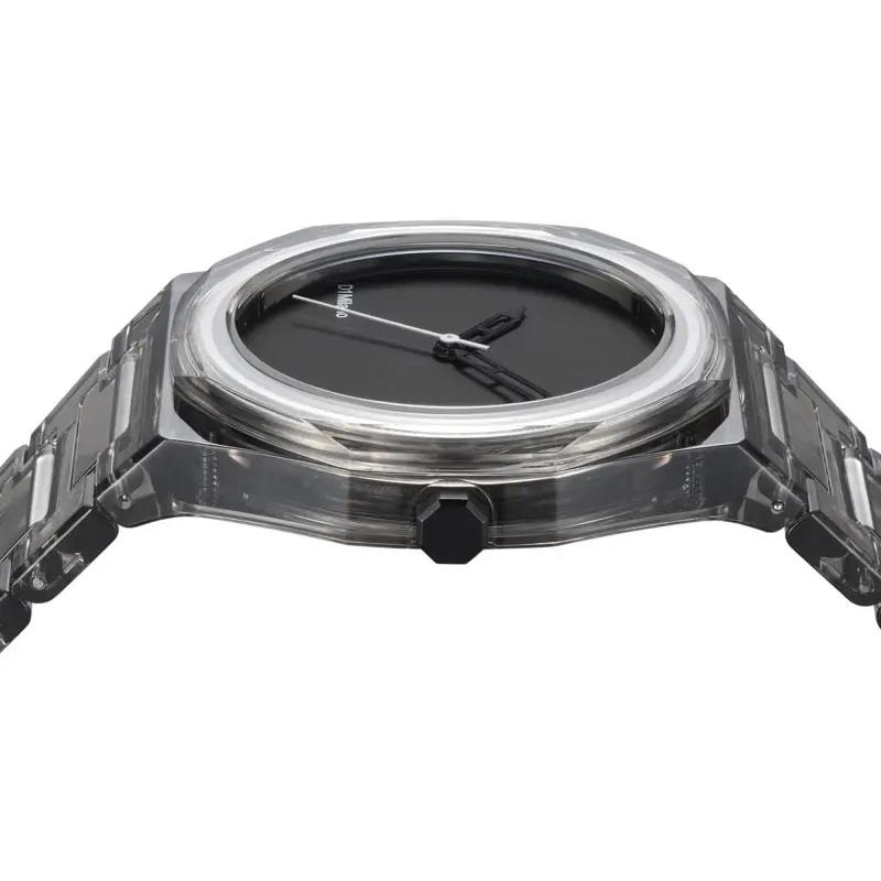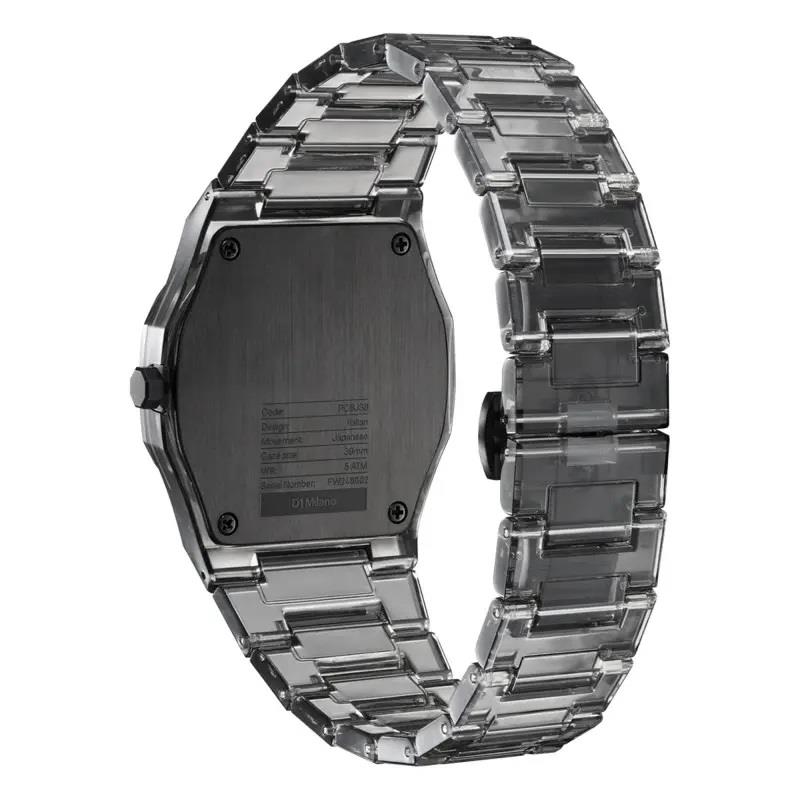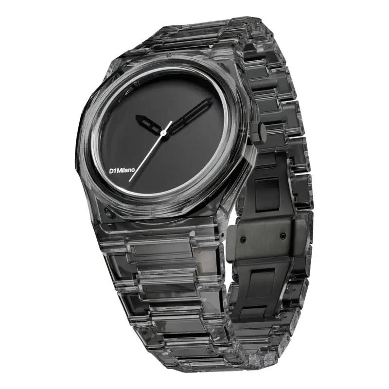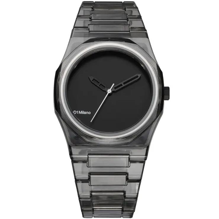 ساعت مچی مردانه دی وان میلانوd1milano با طراحی روزانه بند پلاستیک دودی و قاب گرد دودی و صفحه گرد مشکی با موتور ژاپنی با انرژی باتری و مقاومت در برابر آب تا عمق 50 متر به همراه  گارانتی بین المللی