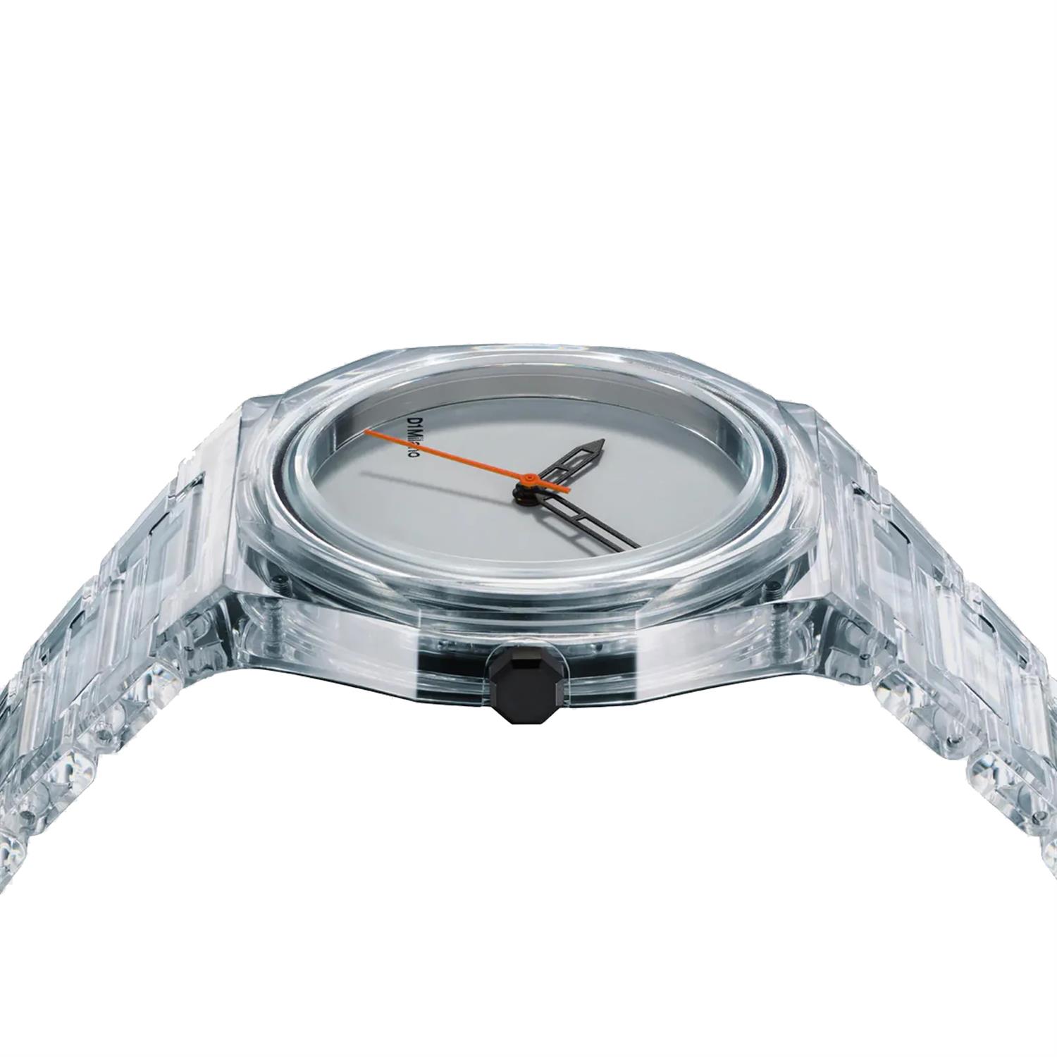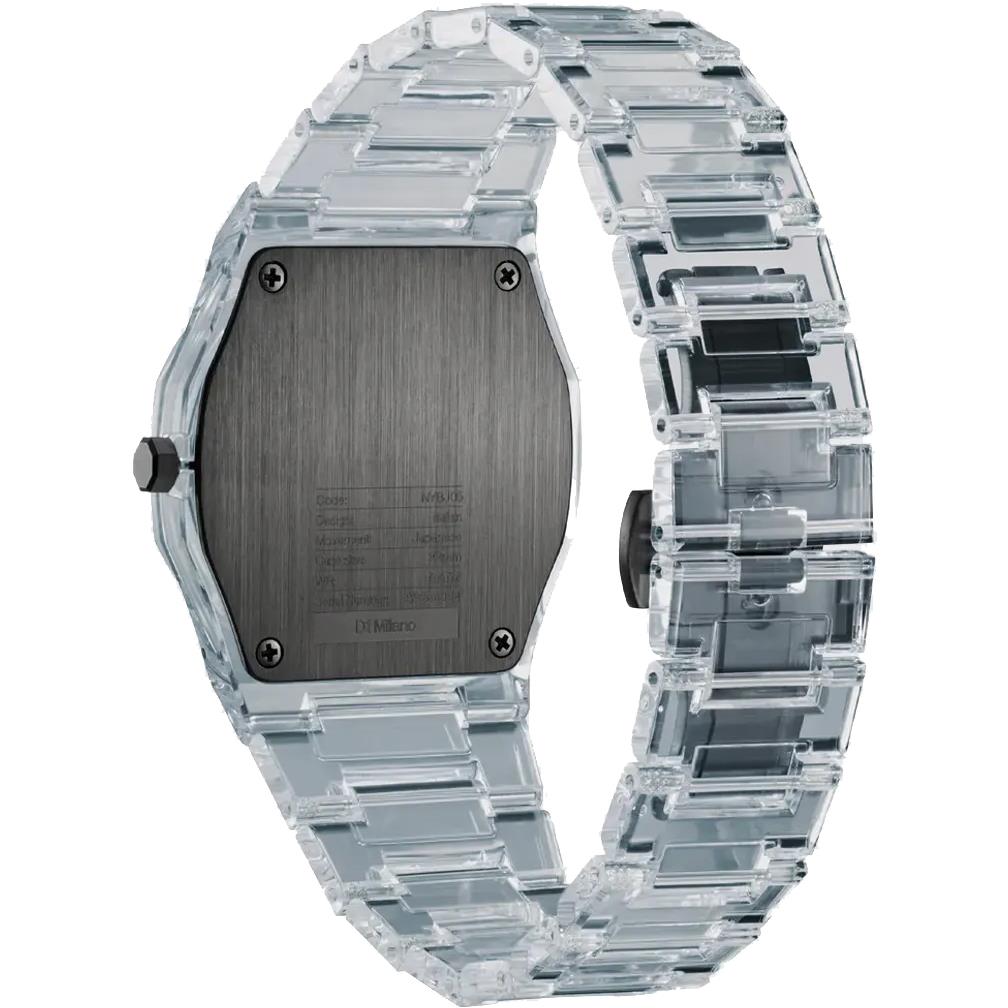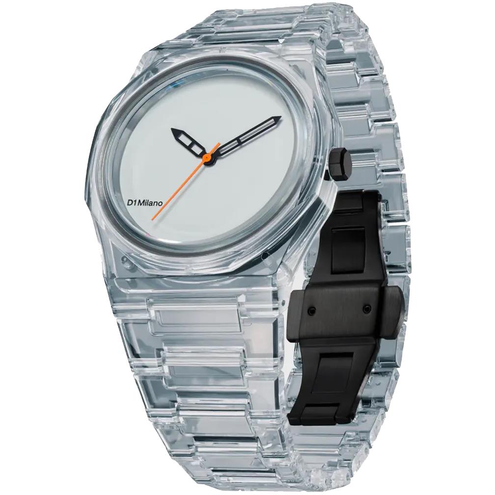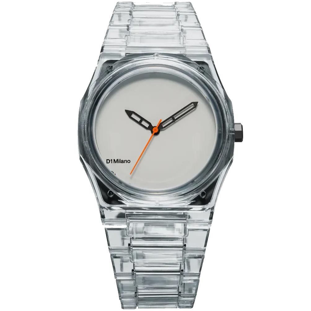 ساعت مچی مردانه دی وان میلانوd1milano با طراحی روزانه بند پلاستیک شیشه ای و قاب گرد شیشه ای و صفحه گرد طوسی با موتور ژاپنی با انرژی باتری و مقاومت در برابر آب تا عمق 50 متر به همراه  گارانتی بین المللی