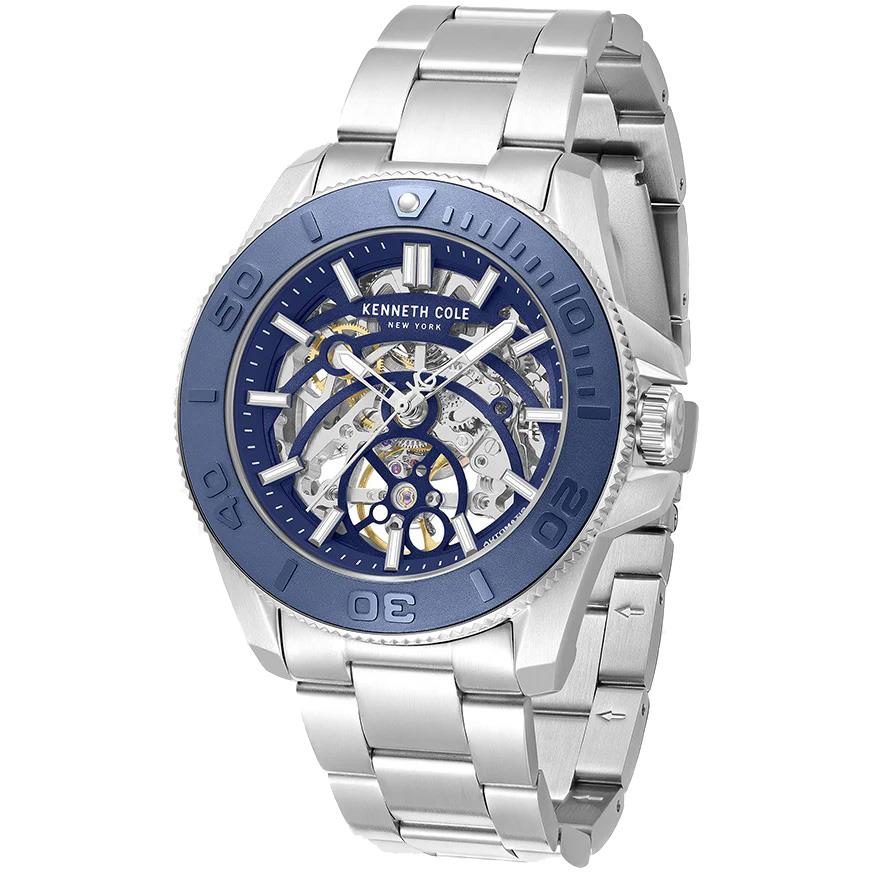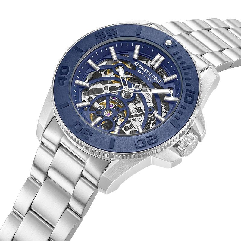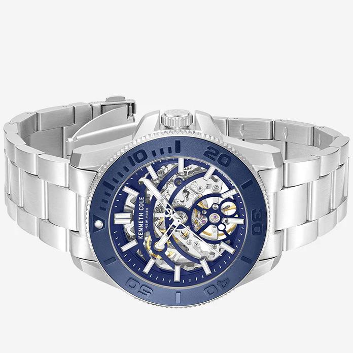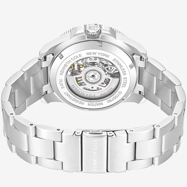 ساعت مچی مردانه کنت کول kenneth cole  با طراحی روزانه بند استیل و قاب گرد فلزی با صفحه اسکلتون سرمه ای با قابلیت داشتن شب نما و موتور اتوماتیک ژاپنی با انرژی مکانیکی و مقاومت در برابر آب تا عمق 50 متر به همراه دو سال گارانتی بین المللی
