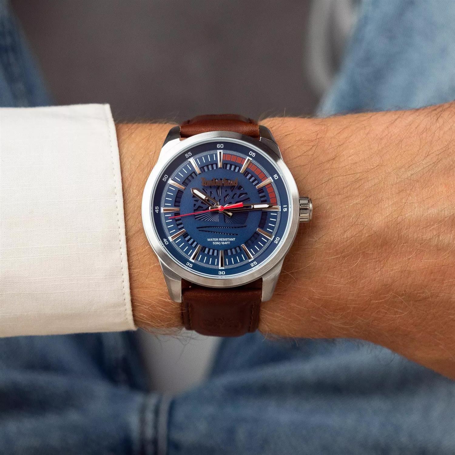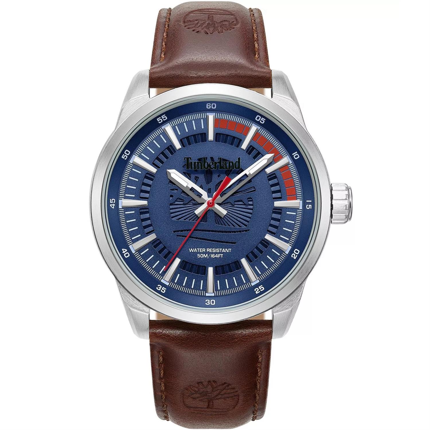 ساعت مچی مردانه تیمبرلند Timberland با طراحی روزانه بند چرمی قهوه ای و قاب استیل و صفحه گرد سرمه ای با قابلیت شب نما و موتور ژاپنی با انرژی باتری و مقاومت در برابر آب تا عمق 50 متر به همراه دو سال گارانتی بین المللی