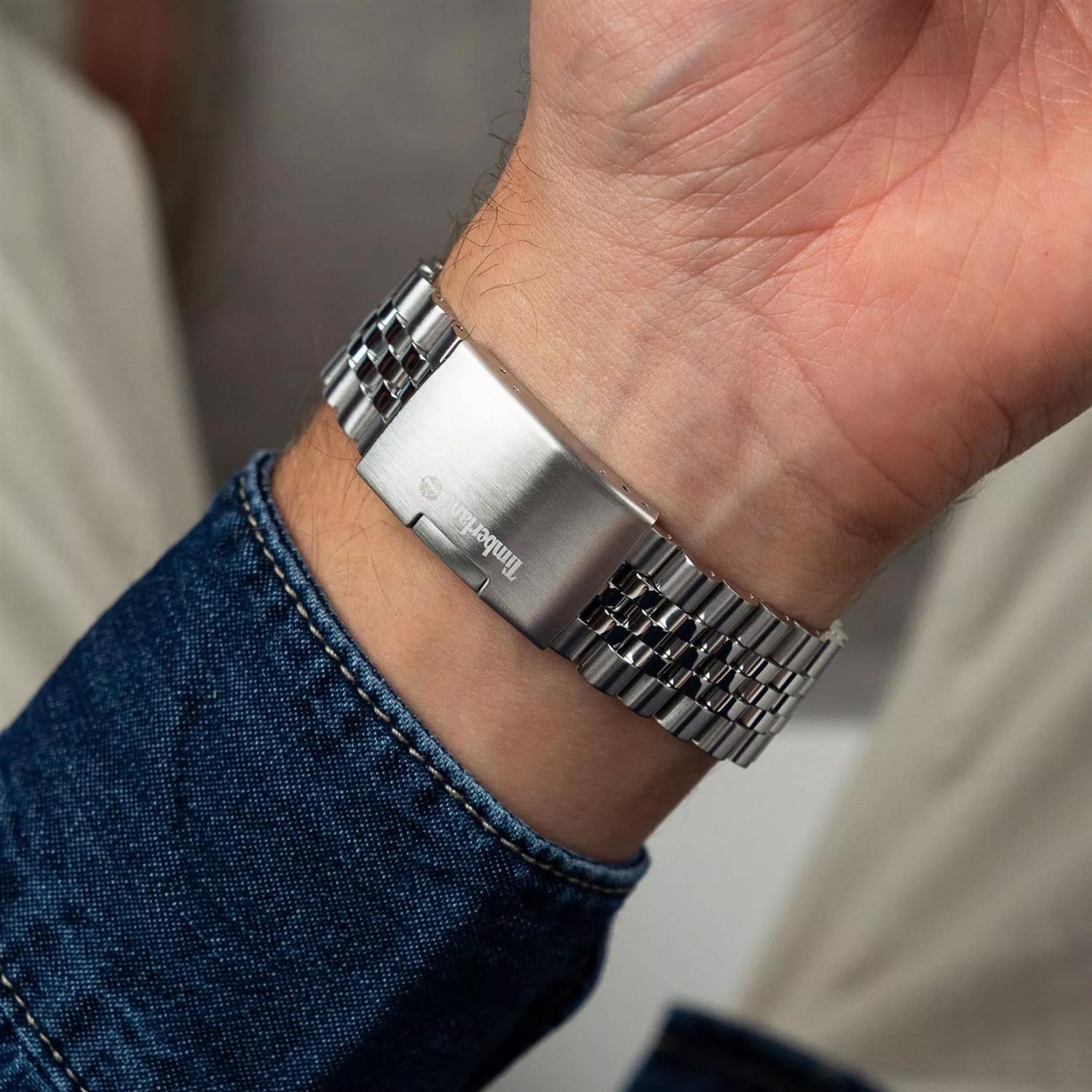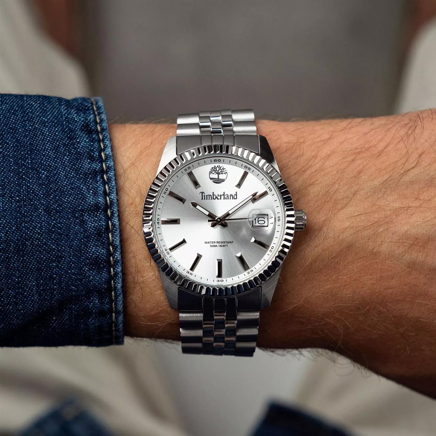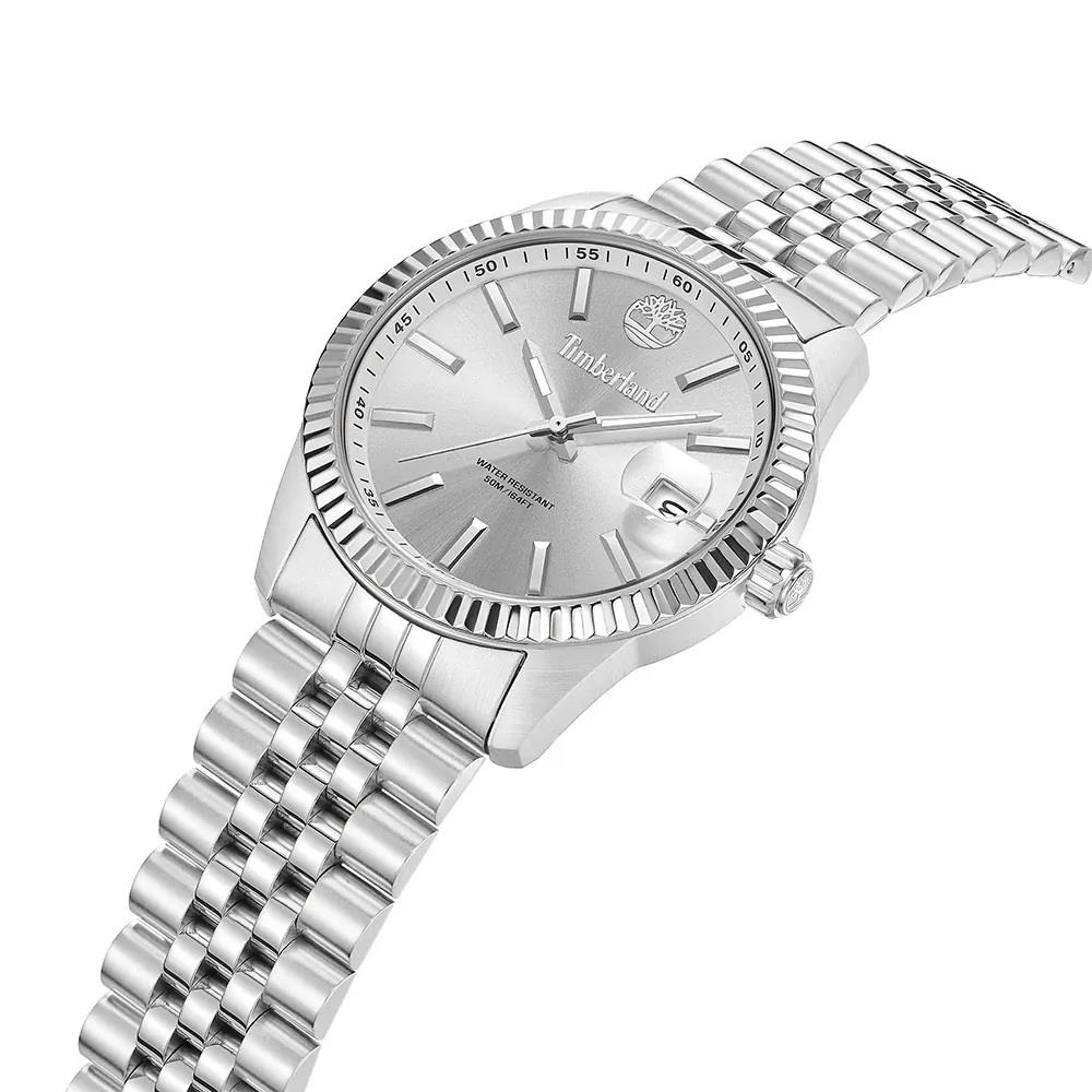 ساعت مچی مردانه تیمبرلند Timberland با طراحی روزانه بند استیل و قاب استیل و صفحه نقره ای با قابلیت شب نما/ تقویم و موتور ژاپنی با انرژی باتری و مقاومت در برابر آب تا عمق 50 متر به همراه دو سال گارانتی بین المللی
