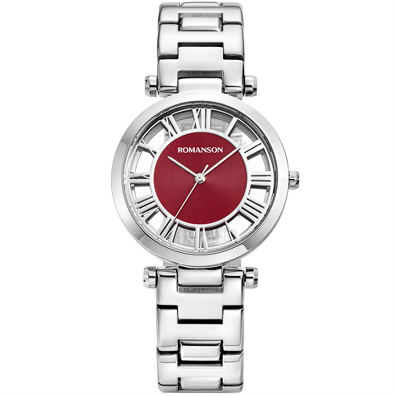 ساعت مچی زنانه رومانسون ROMANSON با طراحی روزانه بند استیل با قاب استیل و صفحه قرمز و موتور سوییسی با انرژی باطری و مقاوم در برابر آب تا عمق 30 متر به همراه دو سال گارانتی بین المللی