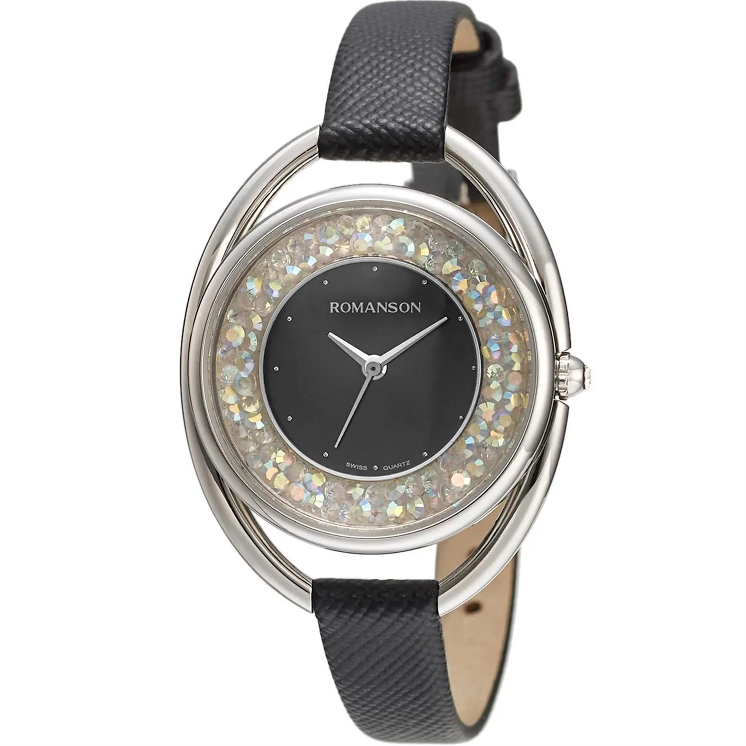 ساعت مچی زنانه رومانسون ROMANSON با طراحی روزانه بند چرمی مشکی با قاب فلزی و صفحه مشکی نگین دار و موتور سوییسی با انرژی باطری و مقاوم در برابر آب تا عمق 30 متر به همراه دو سال گارانتی بین المللی