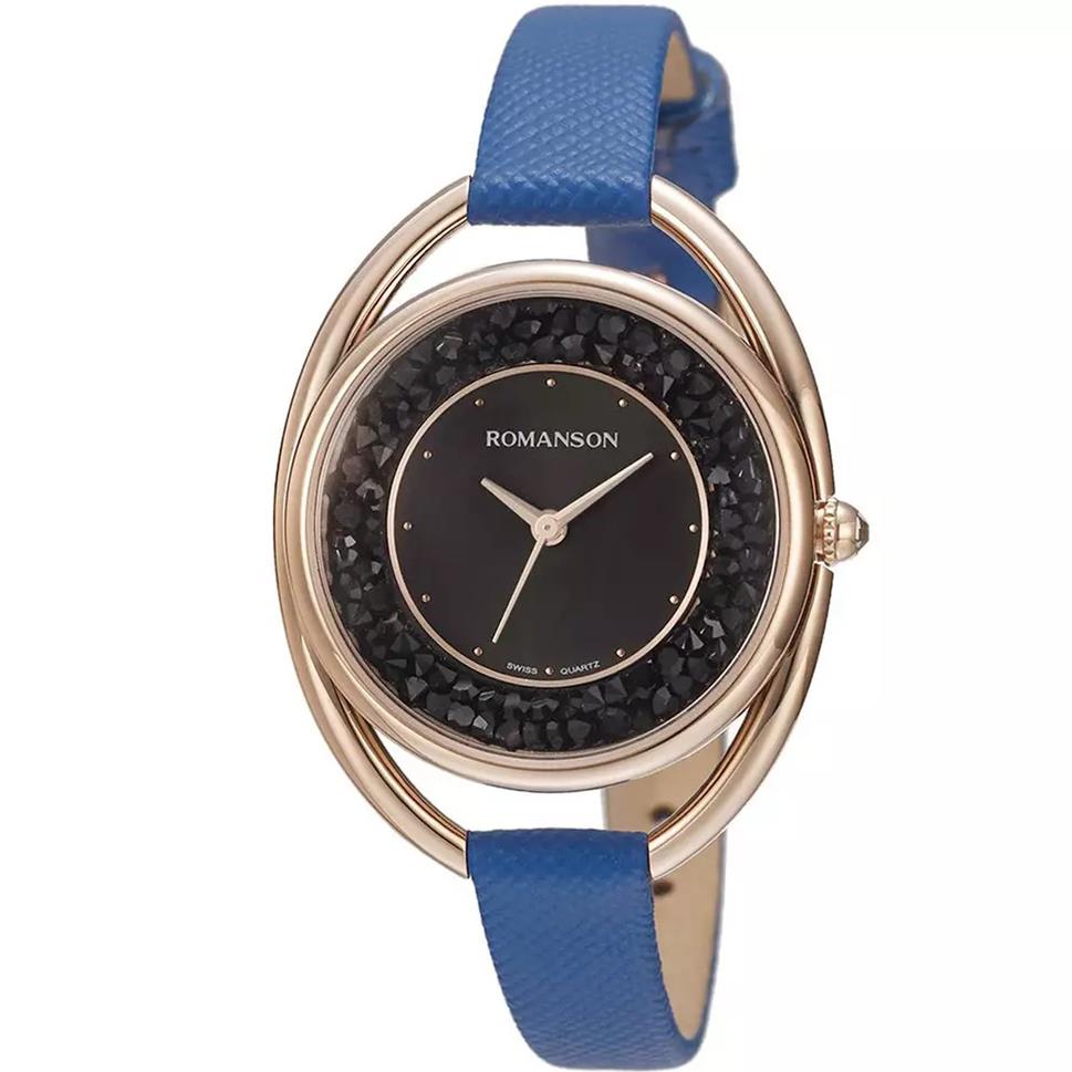 ساعت مچی زنانه رومانسون ROMANSON با طراحی روزانه بند چرمی آبی با قاب متفاوت مسی و صفحه  نگین دار مشکی و موتور سوییسی با انرژی باطری و مقاوم در برابر آب تا عمق 30 متر به همراه دو سال گارانتی بین المللی