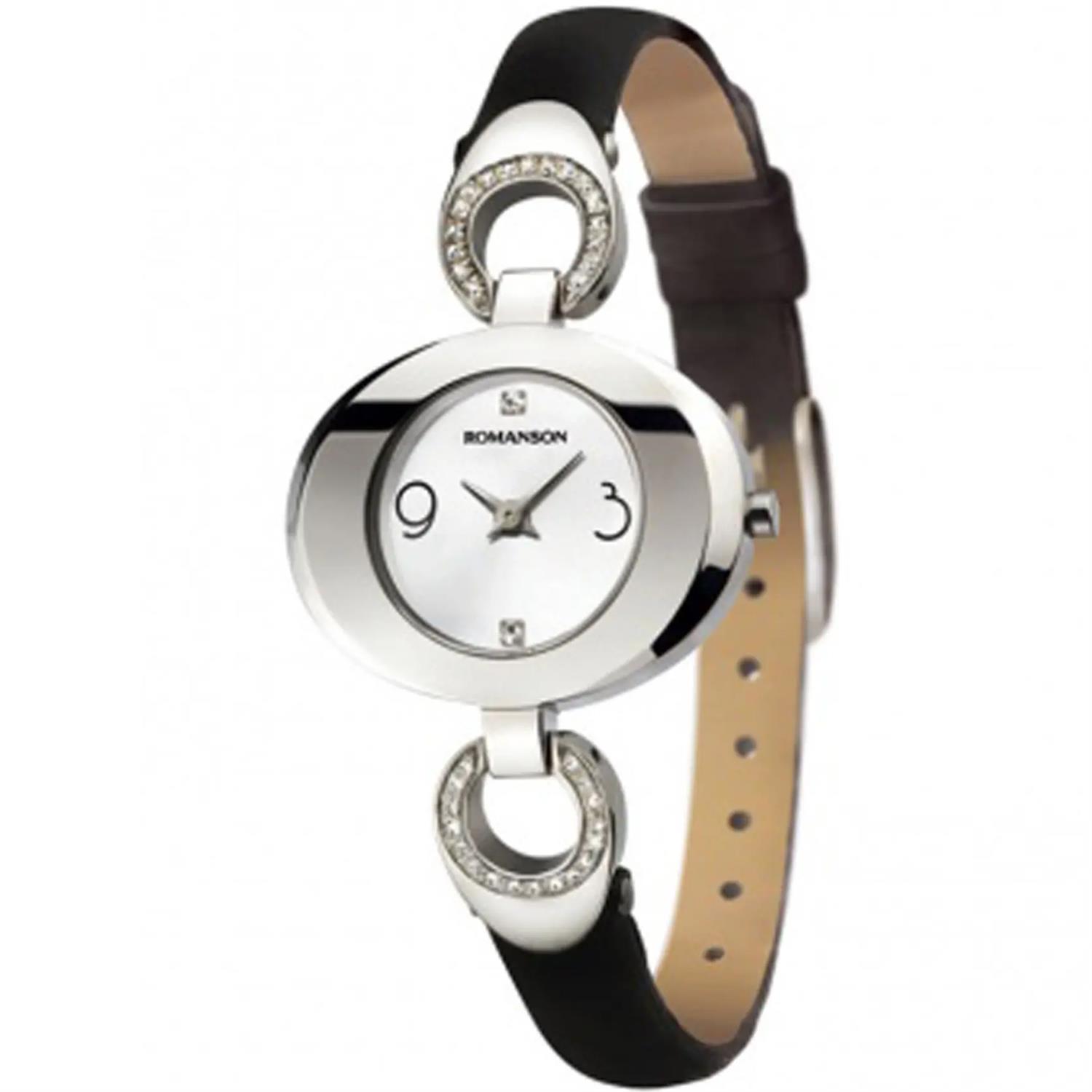 ساعت مچی زنانه رومانسون ROMANSON با طراحی روزانه بند چرمی با قاب بیضی فلزی و صفحه نگین دار سفید و موتور سوییسی با انرژی باطری و مقاوم در برابر آب تا عمق 30 متر به همراه دو سال گارانتی بین المللی