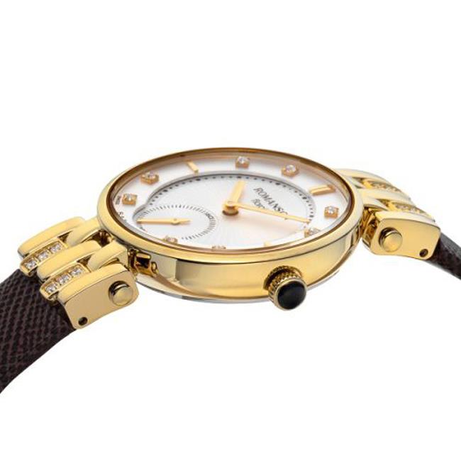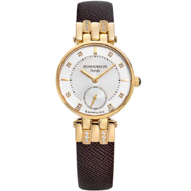 ساعت مچی زنانه رومانسون ROMANSON با طراحی روزانه بند چرمی قهوه ای با قاب گرد طلایی و صفحه نگین دار نقره ای با شیشه ضد خراش و قابلیت داشتن زیر ثانیه و موتور سوییسی با انرژی باطری و مقاوم در برابر آب تا عمق 30 متر به همراه دو سال گارانتی بین المللی