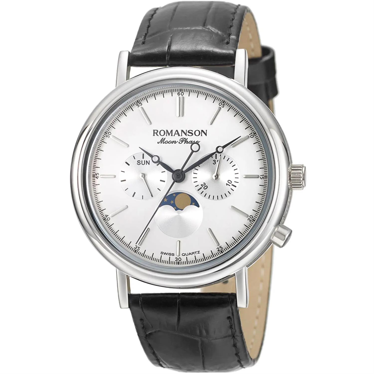 ساعت مچی مردانه رومانسون ROMANSON با طراحی اسپرت بند چرمی با قاب استیل و صفحه نقره ای و موتور سوییسی با انرژی باتری/ قابلیت داشتن روزهای هفته / موقعیت کنونی ماه و ستاره / تقویم و مقاوم در برابر آب تا عمق 30 متر به همراه دو سال گارانتی بین المللی