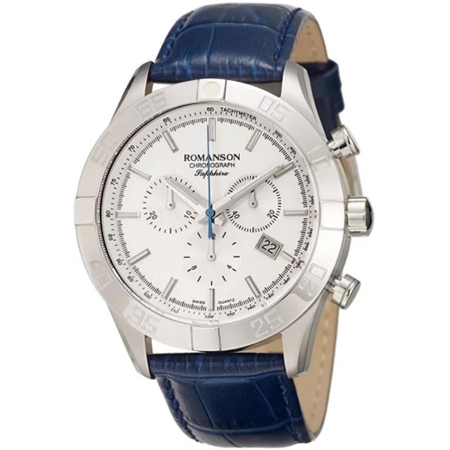 ساعت مچی مردانه رومانسون ROMANSON با طراحی اسپرت بند چرمی سرمه ای با قاب استیل و صفحه سفید با شیشه ضد خراش و موتور سوییسی با انرژی باتری/ قابلیت داشتن زه تاچی متر /شبنما / کرنوگراف / تقویم و مقاوم در برابر آب تا عمق 50 متر به همراه دو سال گارانتی بین المللی