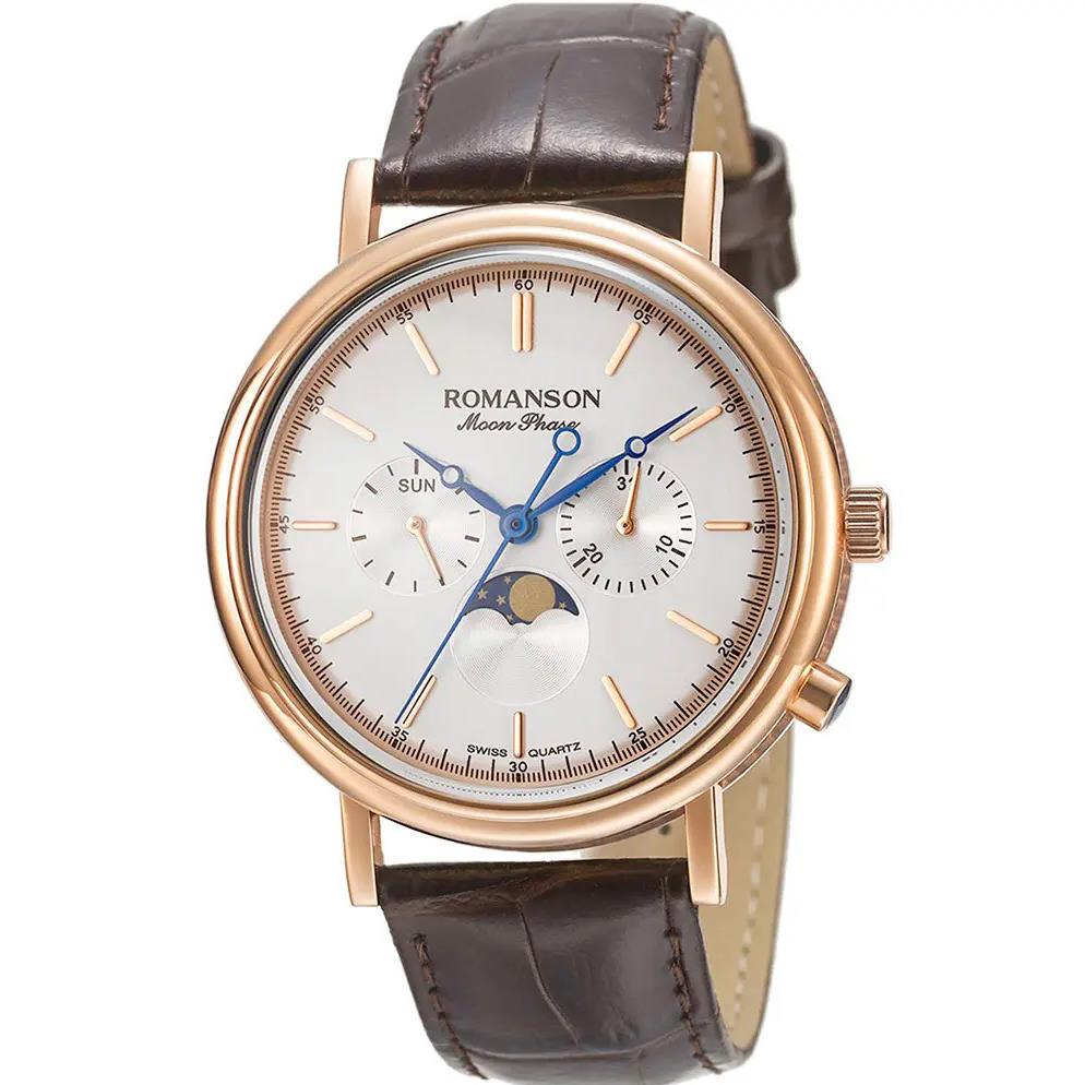 ساعت مچی مردانه رومانسون ROMANSON با طراحی اسپرت بند چرمی قهوه ای با قاب فلزی مسی رنگ و صفحه نقره ای و موتور سوییسی با انرژی باتری/ قابلیت داشتن روزهای هفته / موقعیت کنونی ماه وستاره / تقویم و مقاوم در برابر آب تا عمق 30 متر به همراه دو سال گارانتی بین المللی