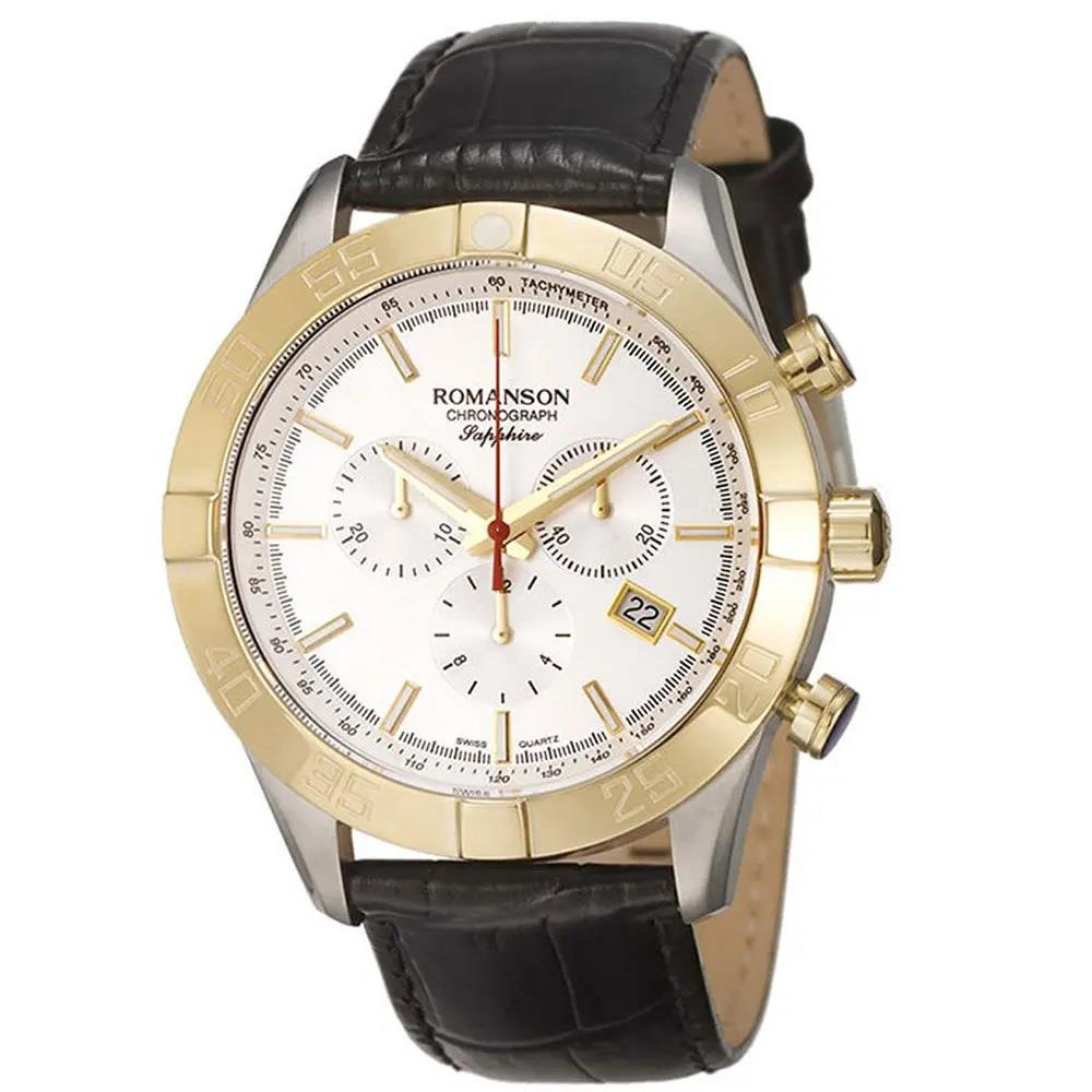 ساعت مچی مردانه رومانسون ROMANSON با طراحی اسپرت بند چرمی قهوه ای با قاب دو رنگ و صفحه سفید با شیشه ضد خراش و موتور سوییسی با انرژی باتری/ قابلیت داشتن شب نما / زه تاچی متر / کرنوگراف / تقویم و مقاوم در برابر آب تا عمق 30 متر به همراه دو سال گارانتی بین المللی