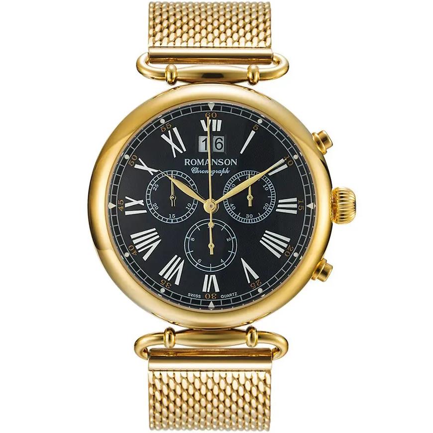ساعت مچی مردانه رومانسون ROMANSON با طراحی اسپرت بند حصیربافت طلایی با قاب طلایی و صفحه گرد مشکی با قابلیت داشتن کرنوگراف/ تقویم و موتور سوییسی با انرژی باتری و مقاوم در برابر آب تا عمق 30 متر به همراه دو سال گارانتی بین المللی