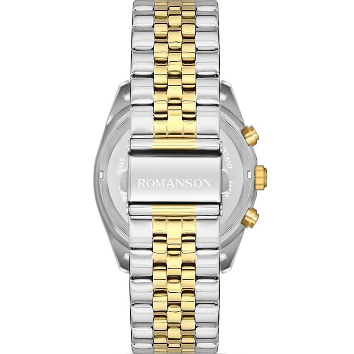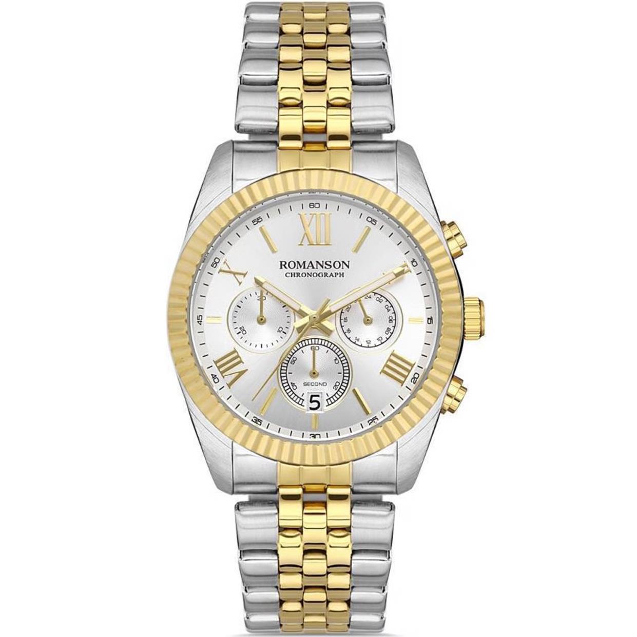 ساعت مچی مردانه رومانسون ROMANSON با طراحی اسپرت بند استیل طلایی با قاب طلایی استیل و صفحه گرد نقره ای با قابلیت داشتن کرنوگراف / تقویم و موتور سوییسی با انرژی باتری و مقاوم در برابر آب تا عمق 50 متر به همراه دو سال گارانتی بین المللی