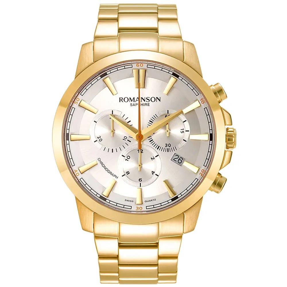 ساعت مچی مردانه رومانسون ROMANSON با طراحی اسپرت بند فلزی طلایی با قاب طلایی و صفحه گرد نقره ای با شیشه ضد خراش و قابلیت داشتن کرنوگراف / تقویم و موتور سوییسی با انرژی باتری و مقاوم در برابر آب تا عمق 30 متر به همراه دو سال گارانتی بین المللی