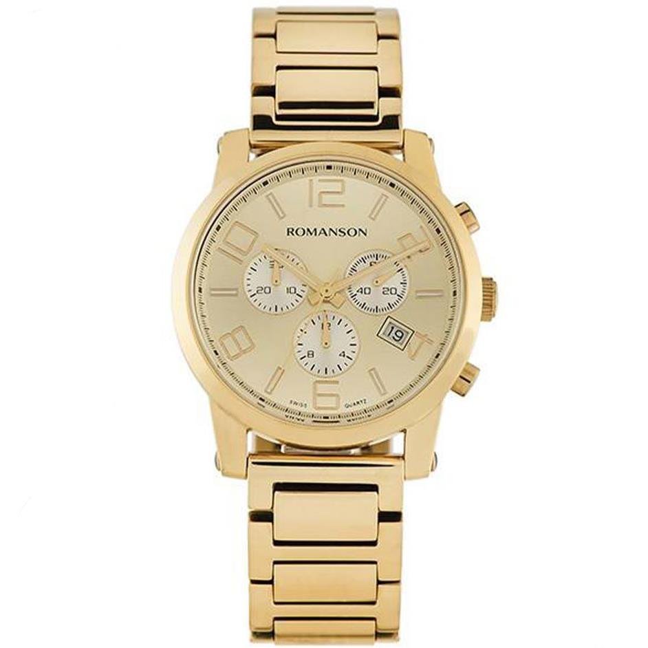 ساعت مچی مردانه رومانسون ROMANSON با طراحی اسپرت بند فلزی طلایی با قاب طلایی و صفحه گرد طلایی و قابلیت داشتن کرنوگراف تقویم و موتور ژاپنی با انرژی باتری و مقاوم در برابر آب تا عمق 30 متر به همراه دو سال گارانتی بین المللی