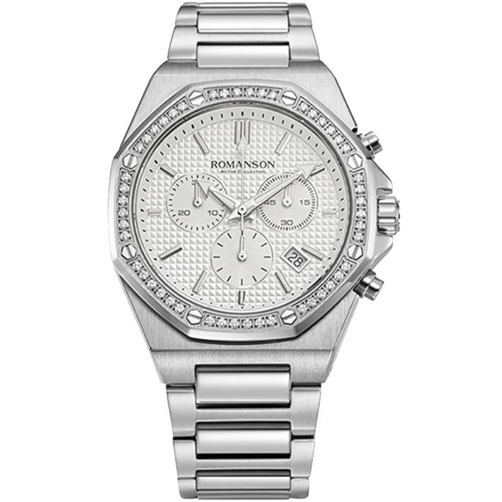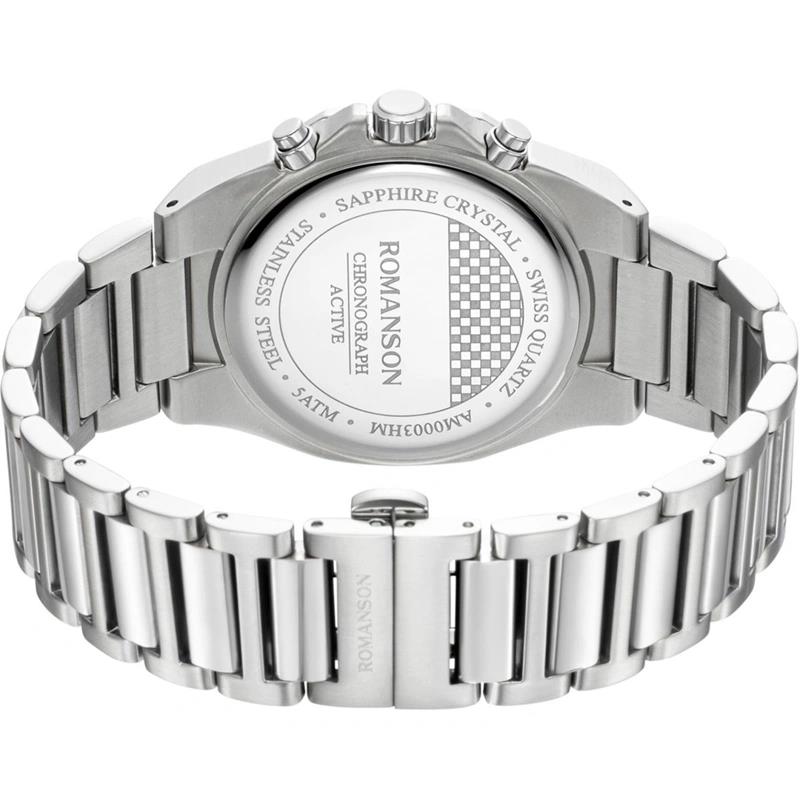 ساعت مچی مردانه رومانسون ROMANSON با طراحی اسپرت بند استیل با قاب نگین داراستیل و صفحه نقره ای با شیشه ضد خراش و قابلیت داشتن  شب نما کرنوگراف تقویم و موتور ژاپنی با انرژی باتری و مقاوم در برابر آب تا عمق 50 متر به همراه دو سال گارانتی بین المللی
