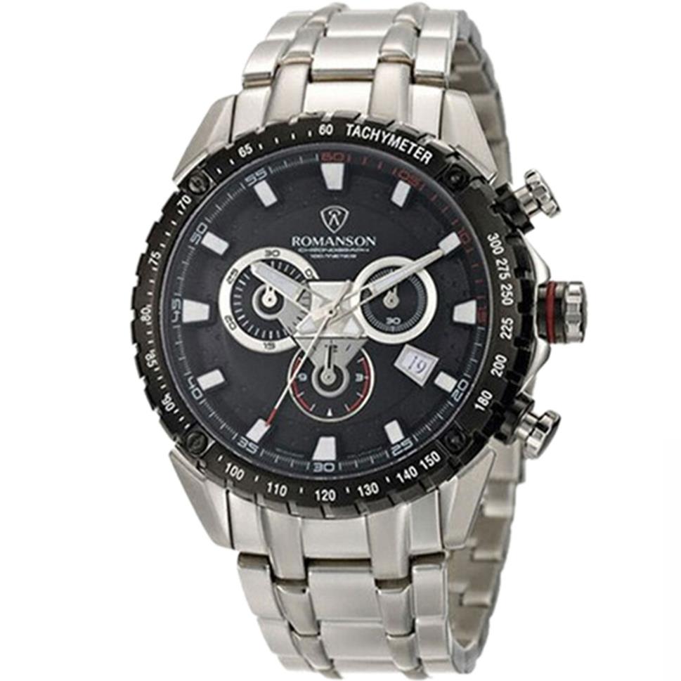 ساعت مچی مردانه رومانسون ROMANSON با طراحی اسپرت بند استیل با قاب استیل مشکیو صفحه مشکی با شیشه ضد خراش و قابلیت داشتن کرنوگراف / شب نما / تقویم / زه تاچی متر و موتور ژاپنی با انرژی باتری و مقاوم در برابر آب تا عمق 100 متر به همراه دو سال گارانتی بین المللی