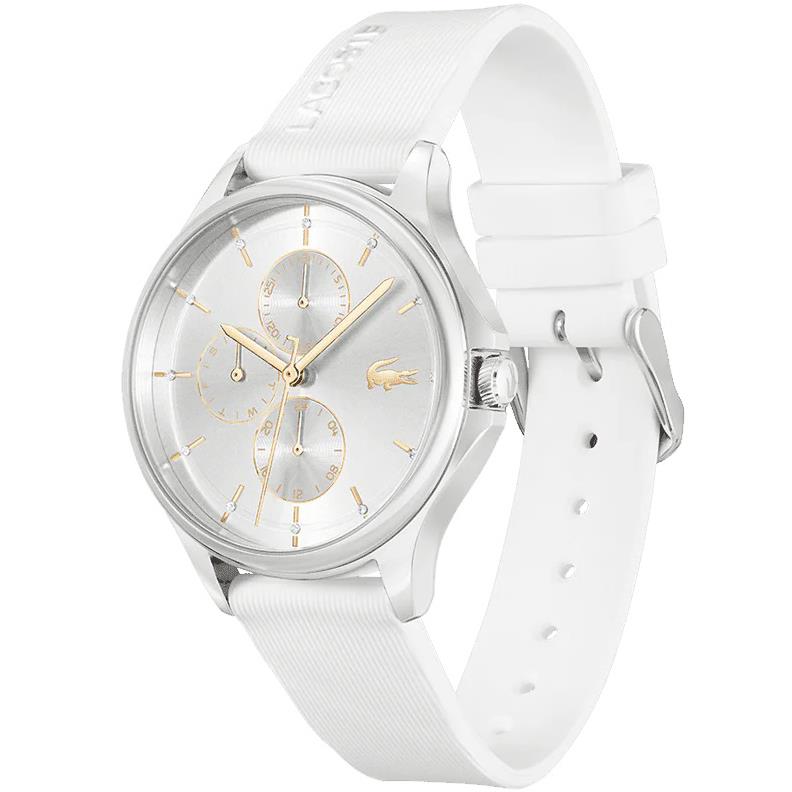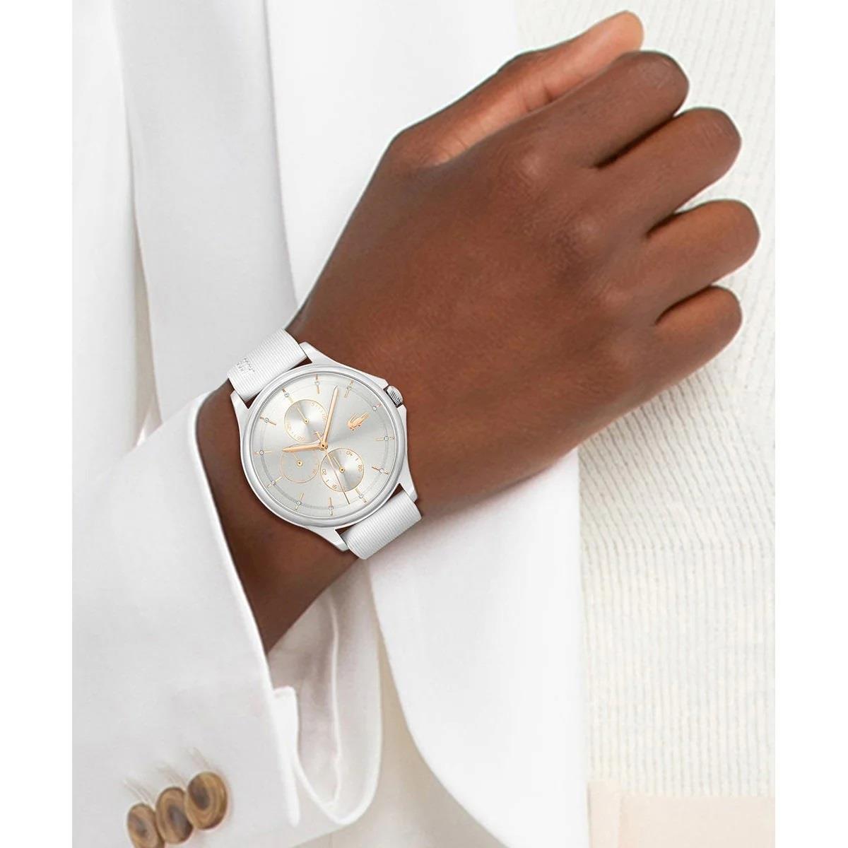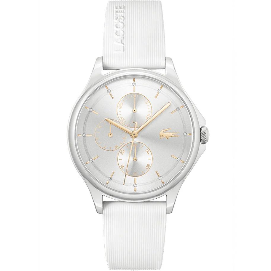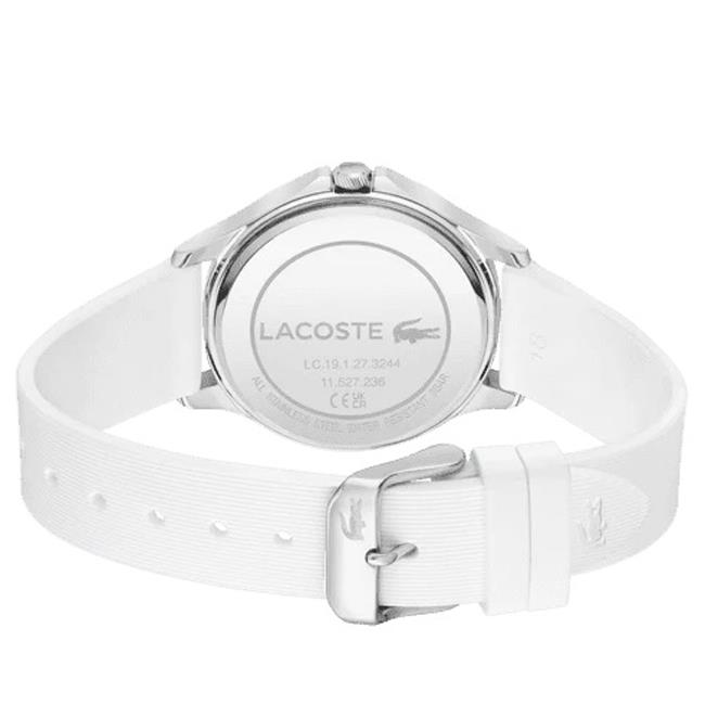 ساعت مچی زنانه لاگوست Lacoste با طراحی روزانه بند سیلیکونی سفید با قاب استیل و صفحه نگین دار نقره ای با قابلیت داشتن روزوهای هفته روز و شب تقویم  و موتور ژاپنی با انرژی باتری و مقاوم در برابر آب تا عمق 30 متر به همراه گارانتی بین المللی