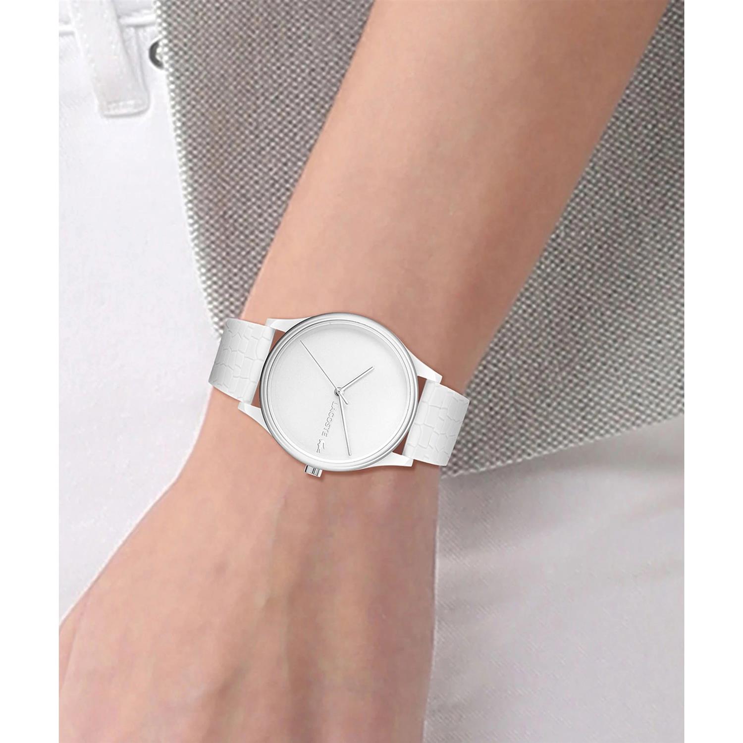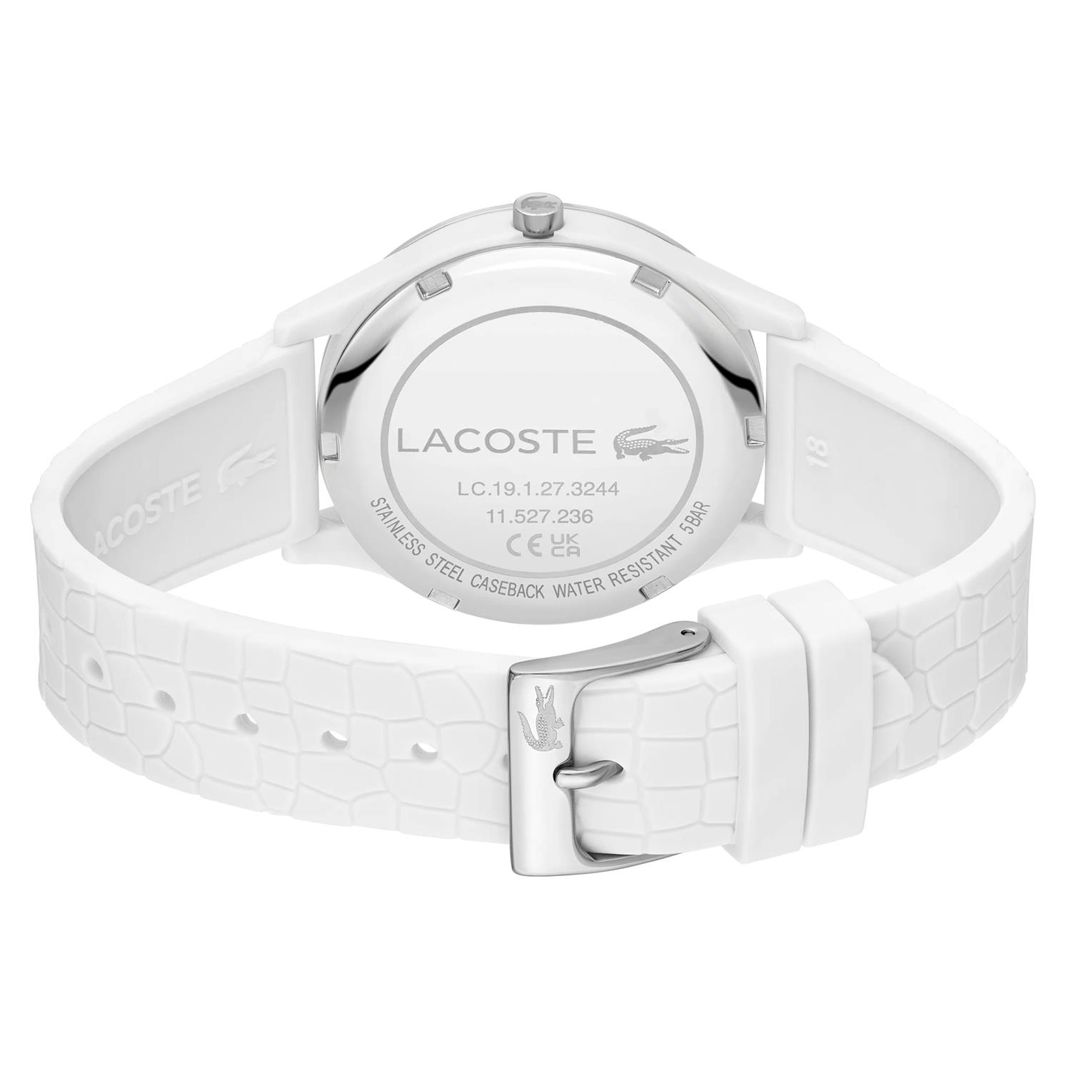 ساعت مچی زنانه لاگوست Lacoste با طراحی روزانه بند سیلیکونی سفید با قاب استیل سفید و صفحه نقره ای و موتور ژاپنی با انرژی باتری و مقاوم در برابر آب تا عمق 50 متر به همراه گارانتی بین المللی