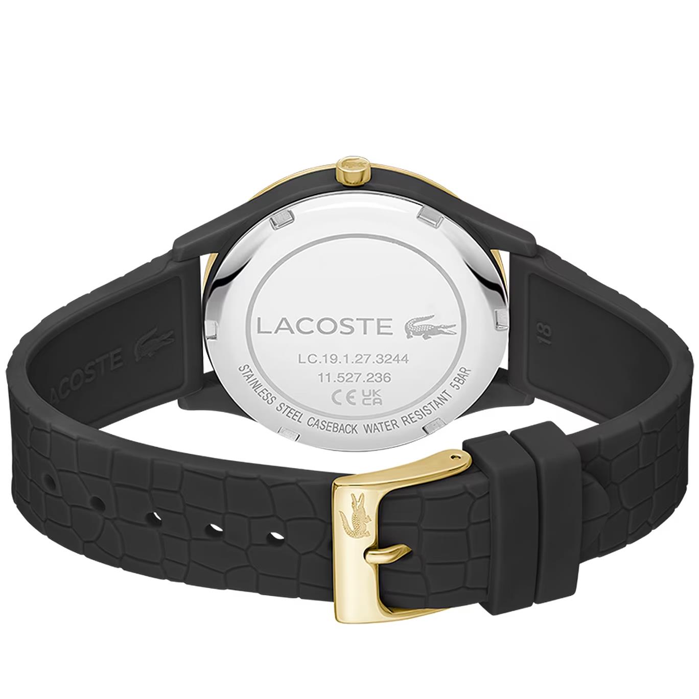 ساعت مچی زنانه لاگوست Lacoste با طراحی روزانه بند سیلیکونی با قاب دو رنگ و صفحه مشکی و موتور ژاپنی با انرژی باتری و مقاوم در برابر آب تا عمق 50 متر به همراه گارانتی بین المللی