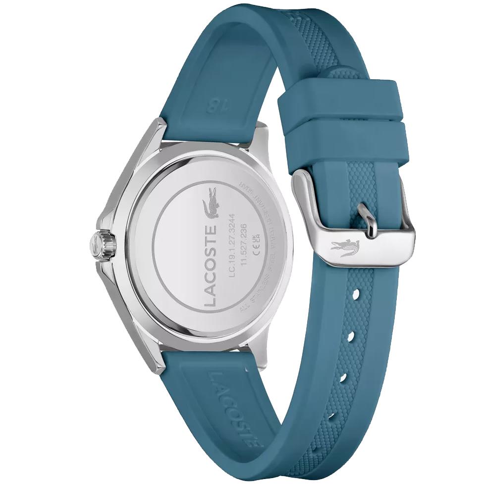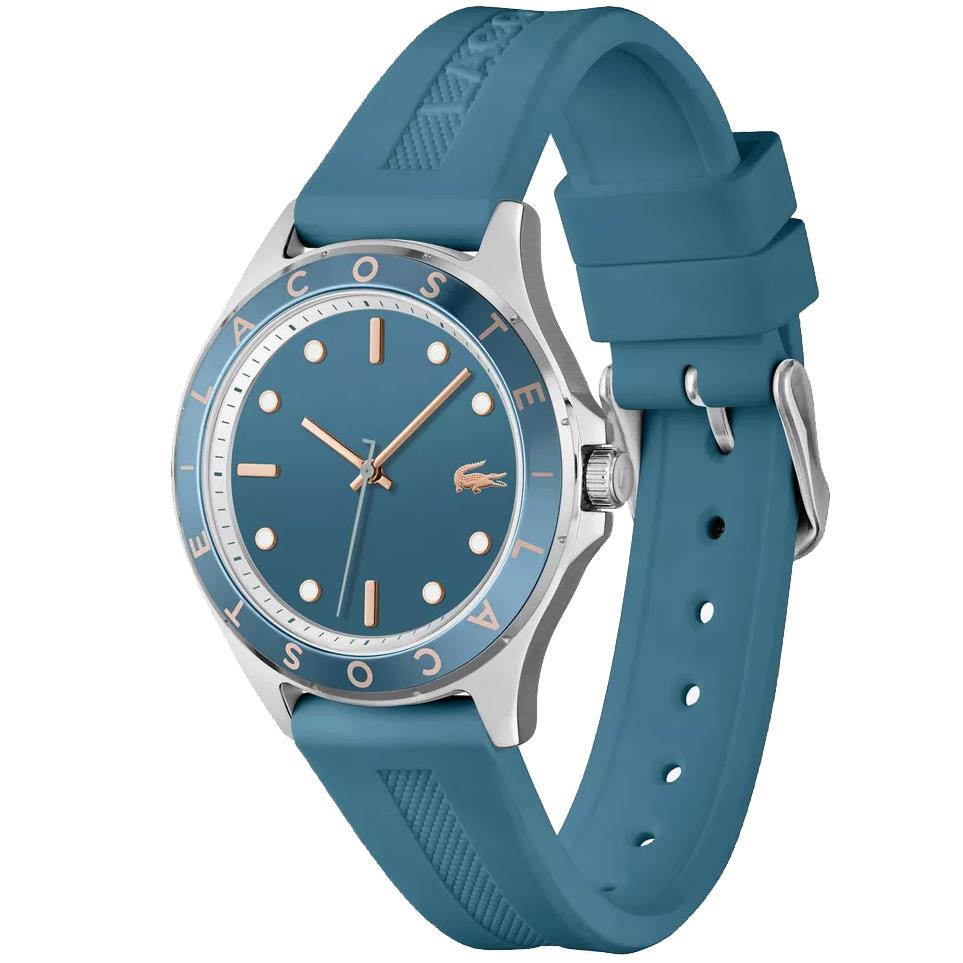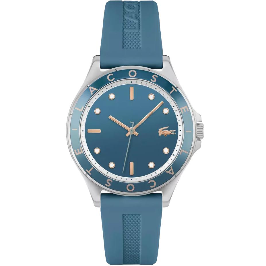 ساعت مچی زنانه لاگوست Lacoste با طراحی روزانه بند سیلیکونی آبی با قاب دو رنگ و صفحه آبی با قابلیت داشتن شب نما و موتور ژاپنی با انرژی باتری و مقاوم در برابر آب تا عمق 50 متر به همراه گارانتی بین المللی