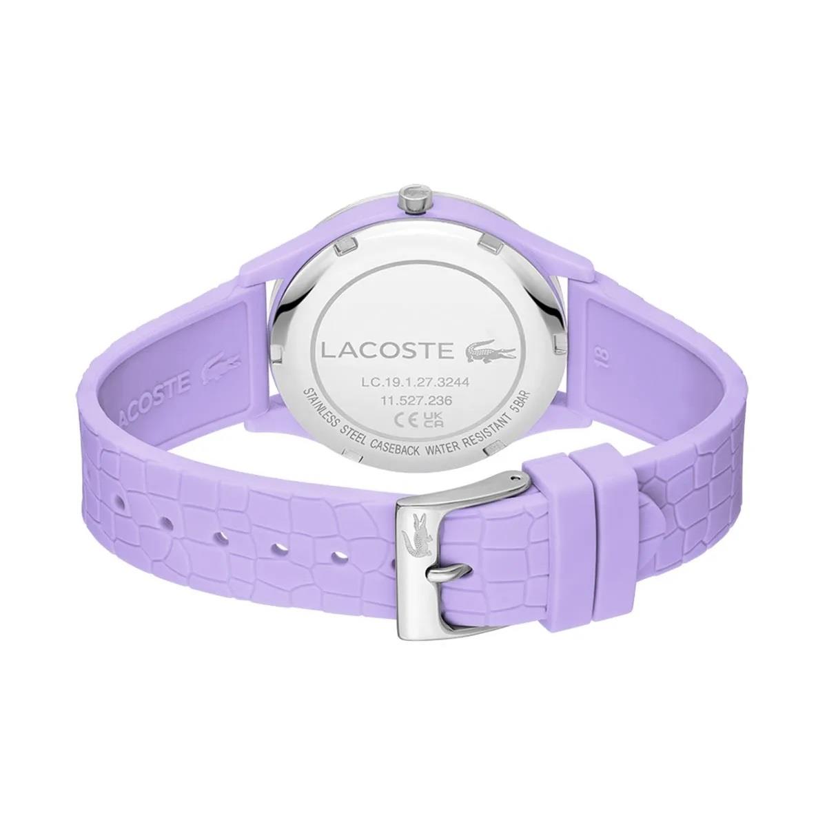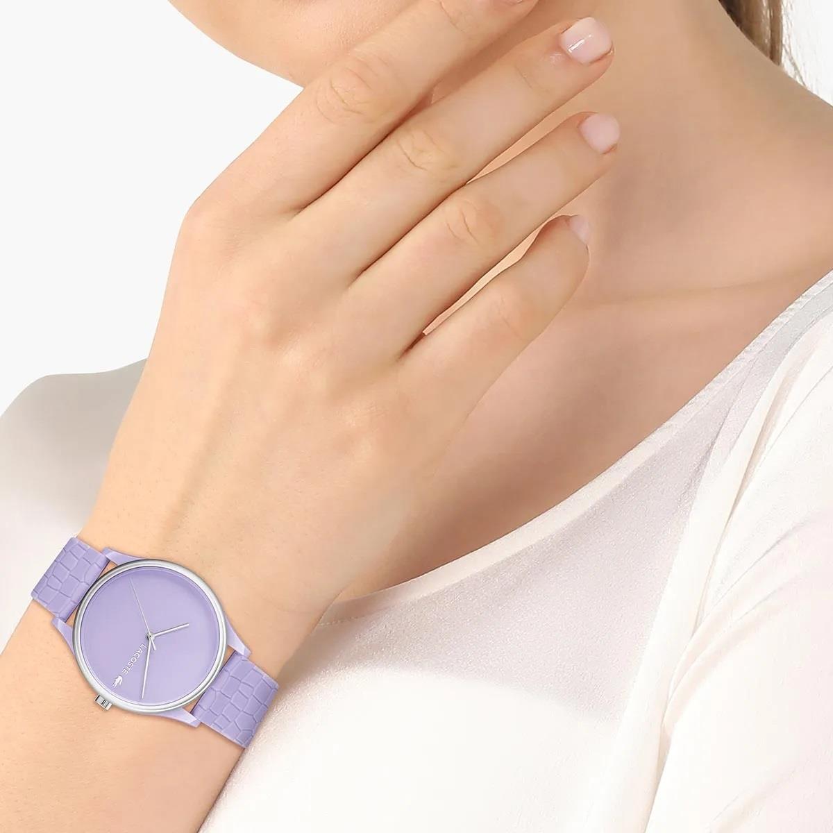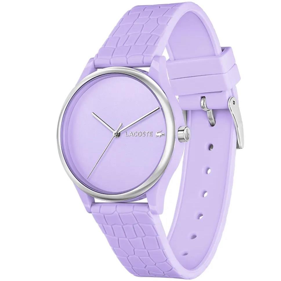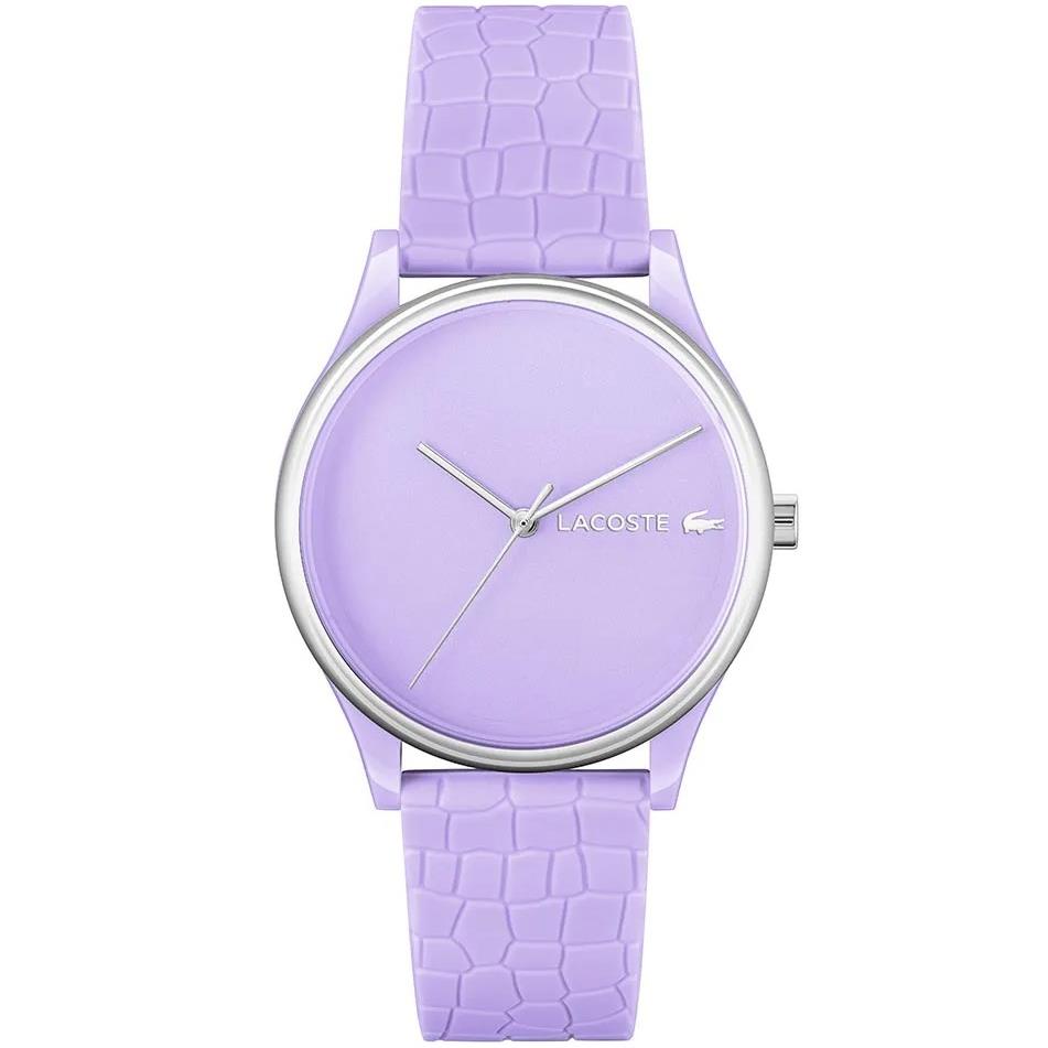 ساعت مچی زنانه لاگوست Lacoste با طراحی روزانه بند سیلیکونی بنفش با قاب دو رنگ و صفحه بنفش و موتور ژاپنی با انرژی باتری و مقاوم در برابر آب تا عمق 50 متر به همراه گارانتی بین المللی