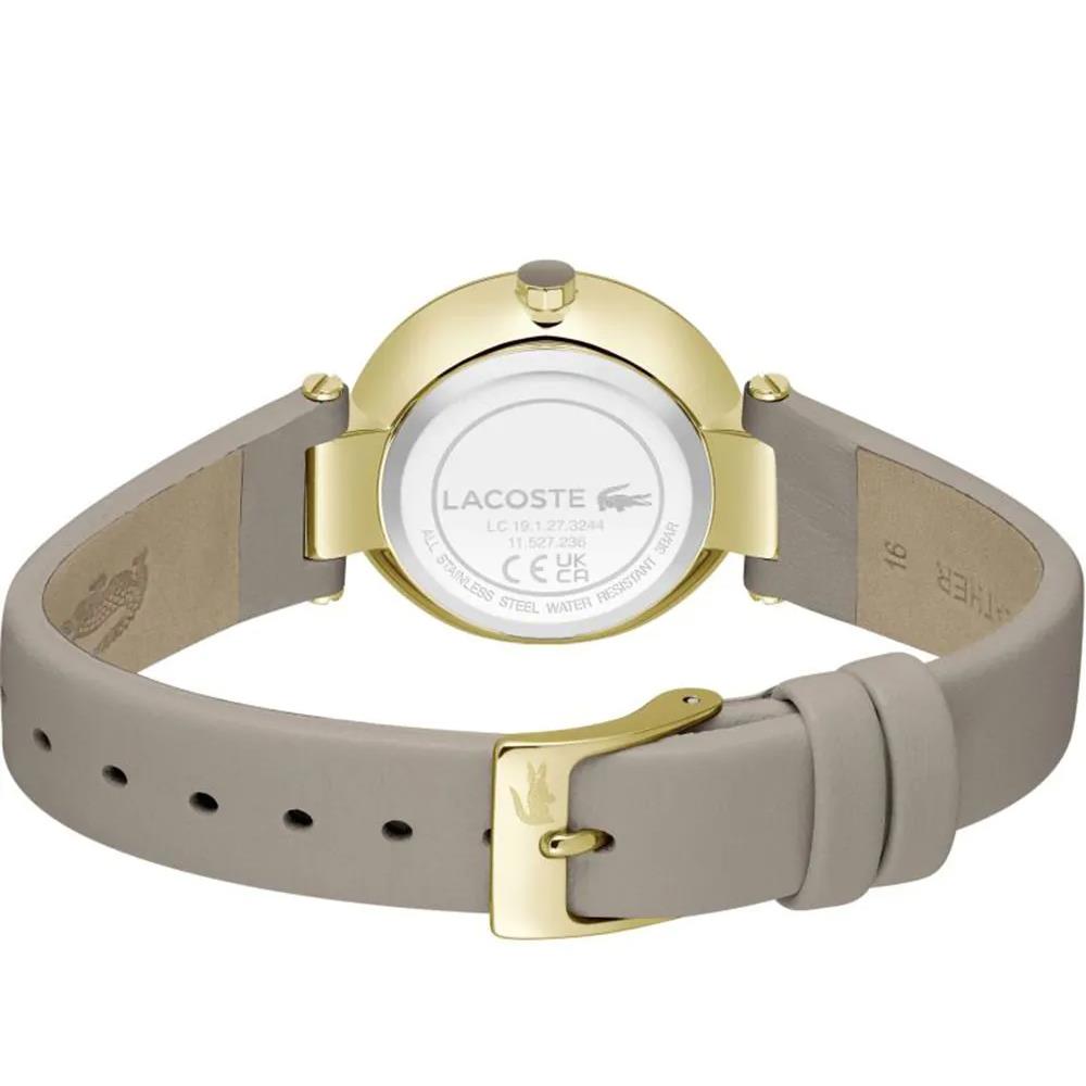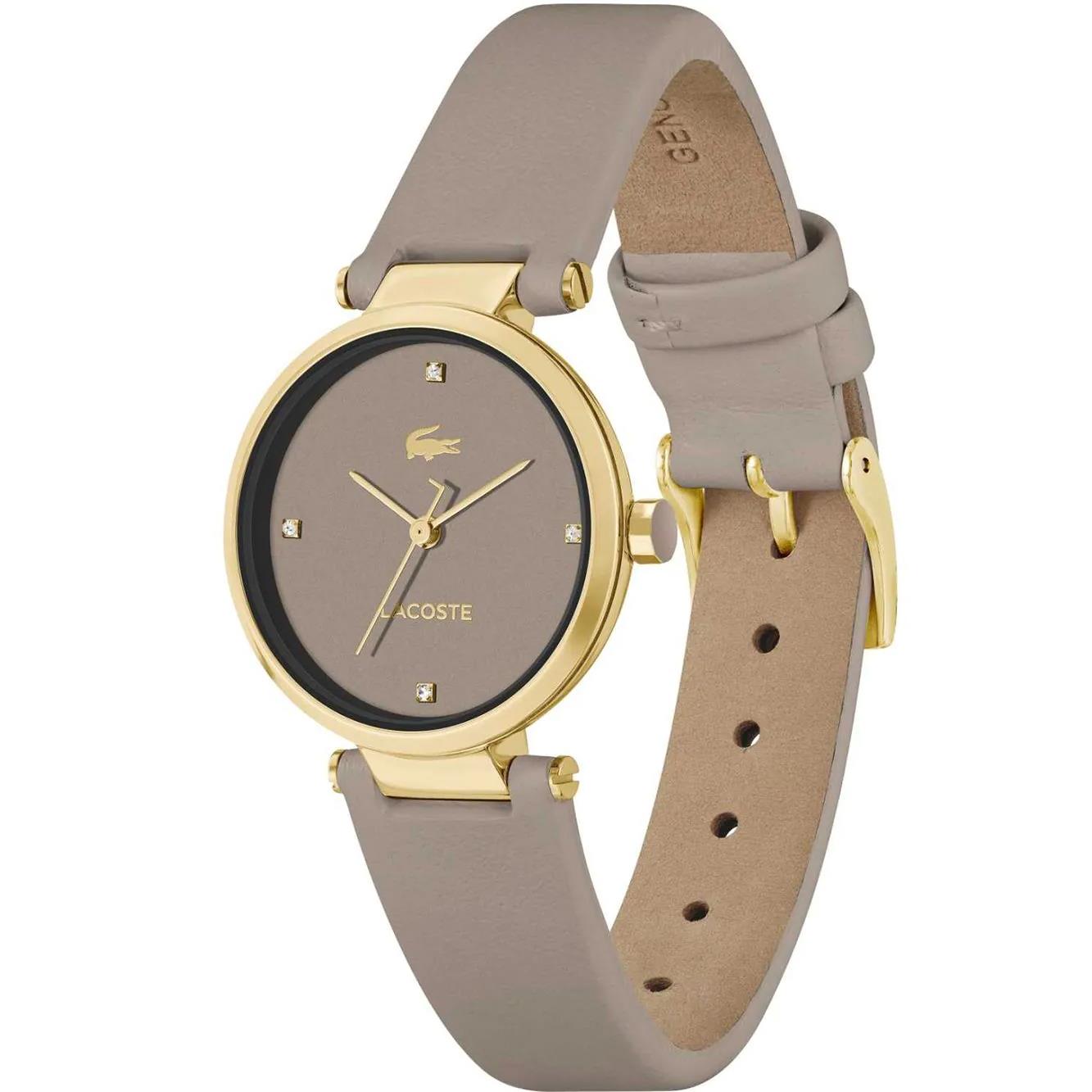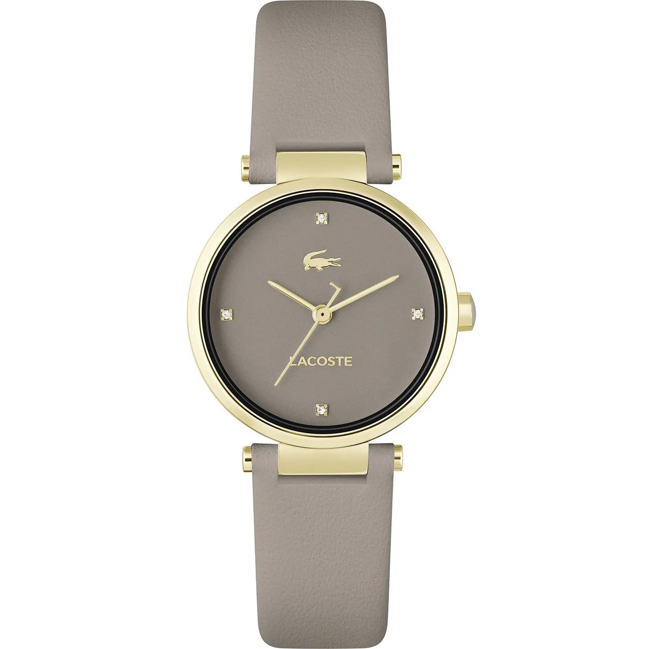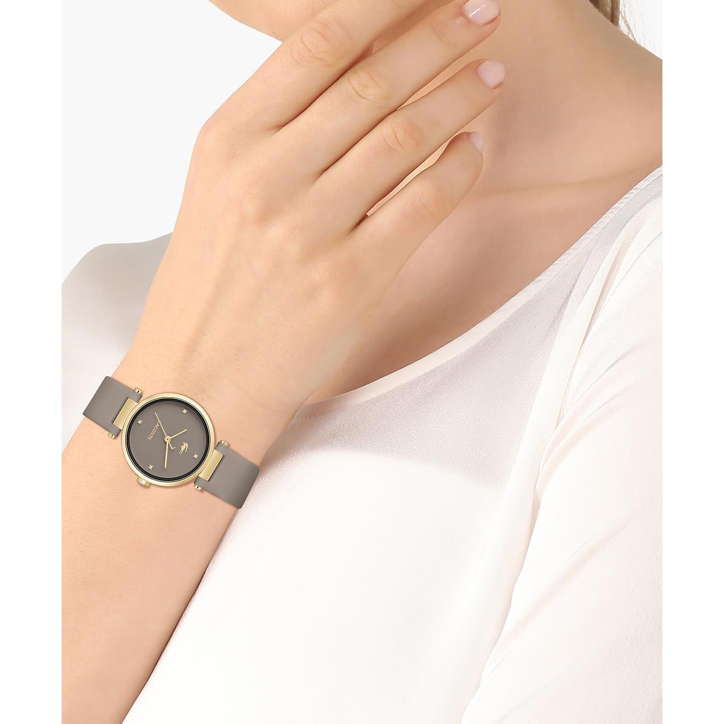 ساعت مچی زنانه لاگوست Lacoste با طراحی روزانه بند چرمی طوسی با قاب فلزی طلایی و صفحه نگین دار طوسی و موتور ژاپنی با انرژی باتری و مقاوم در برابر آب تا عمق 30 متر به همراه گارانتی بین المللی
