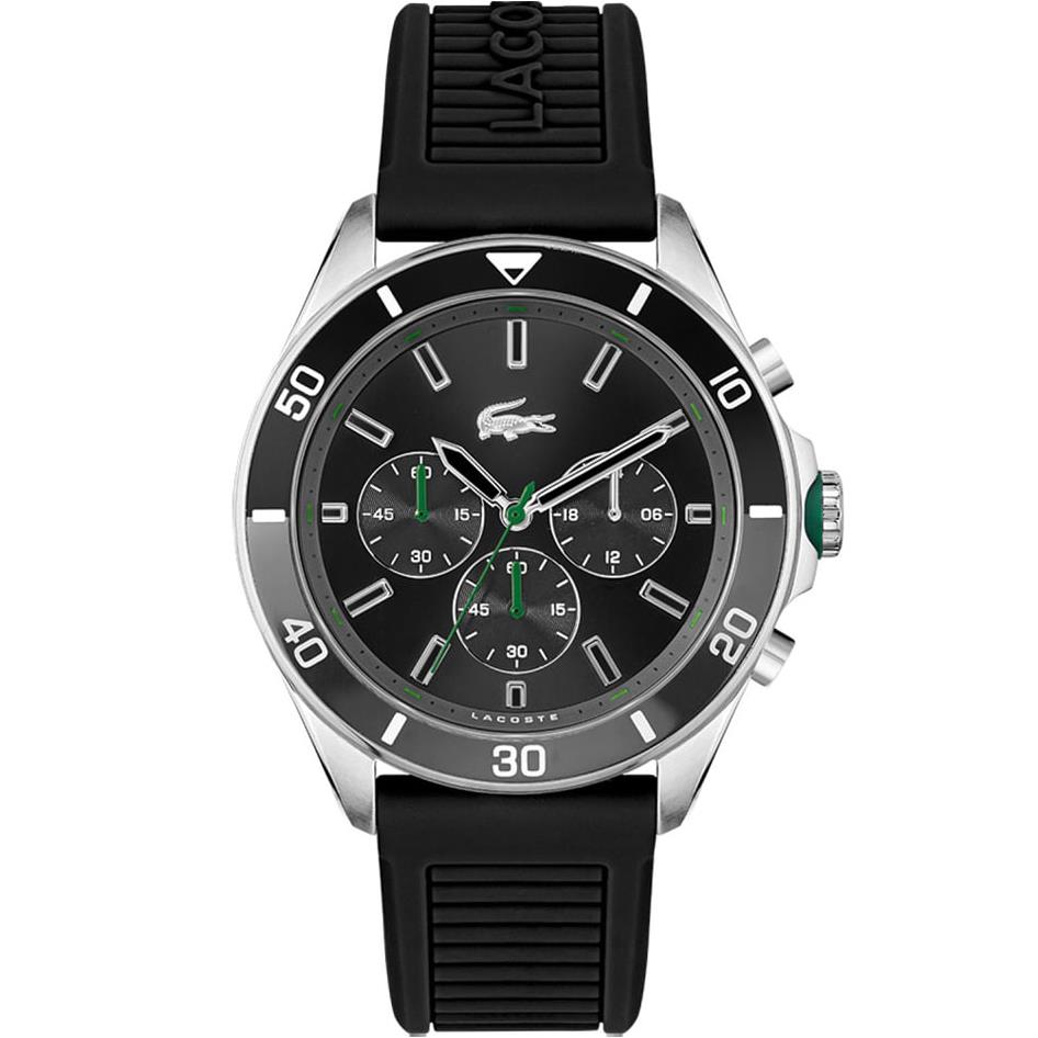 ساعت مچی مردانه لاگوست Lacoste با طراحی روزانه بند سیلیکونی مشکی با قاب فلزی و صفحه مشکی با قابلیت داشتن کرنوگراف / روزوشب / شب نما و موتور ژاپنی با انرژی باتری و مقاوم در برابر آب تا عمق 50 متر به همراه گارانتی بین المللی