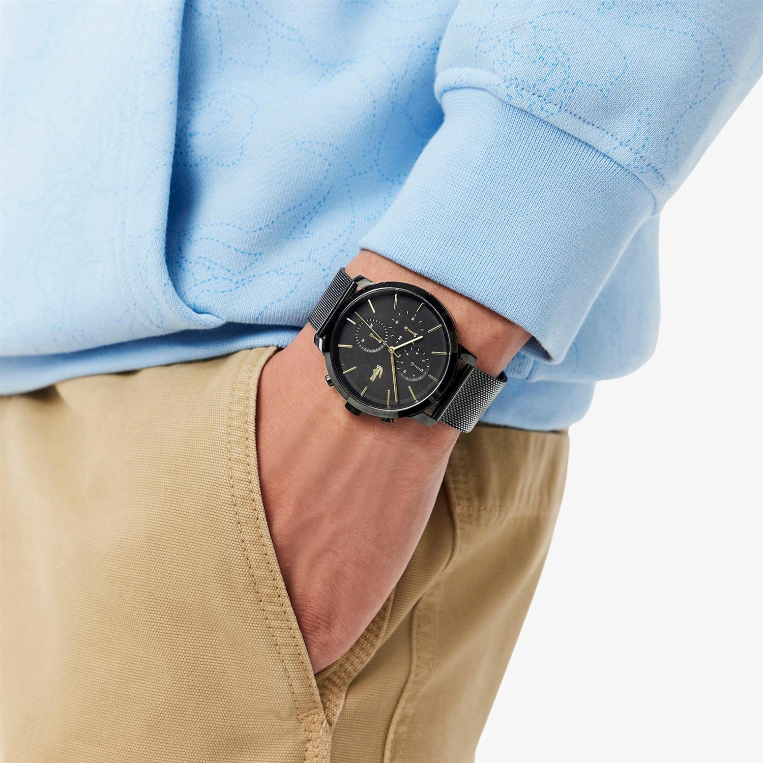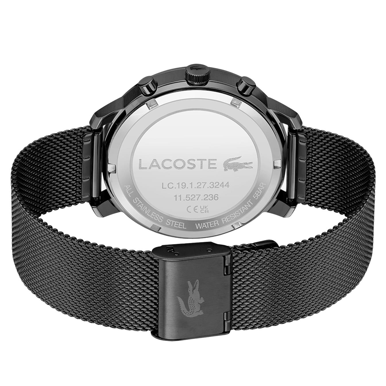 ساعت مچی مردانه لاگوست Lacoste با طراحی روزانه بند حصیربافت مشکی با قاب فلزی مشکی و صفحه مشکی با قابلیت داشتن روزهای هفته / روزوشب / تقویم و موتور ژاپنی با انرژی باتری و مقاوم در برابر آب تا عمق 50 متر به همراه گارانتی بین المللی