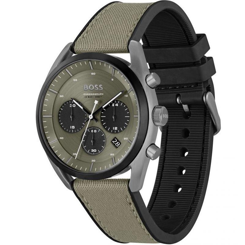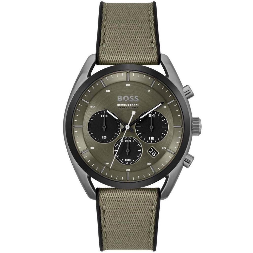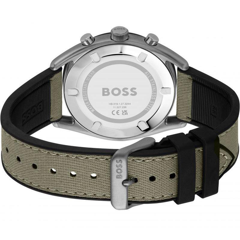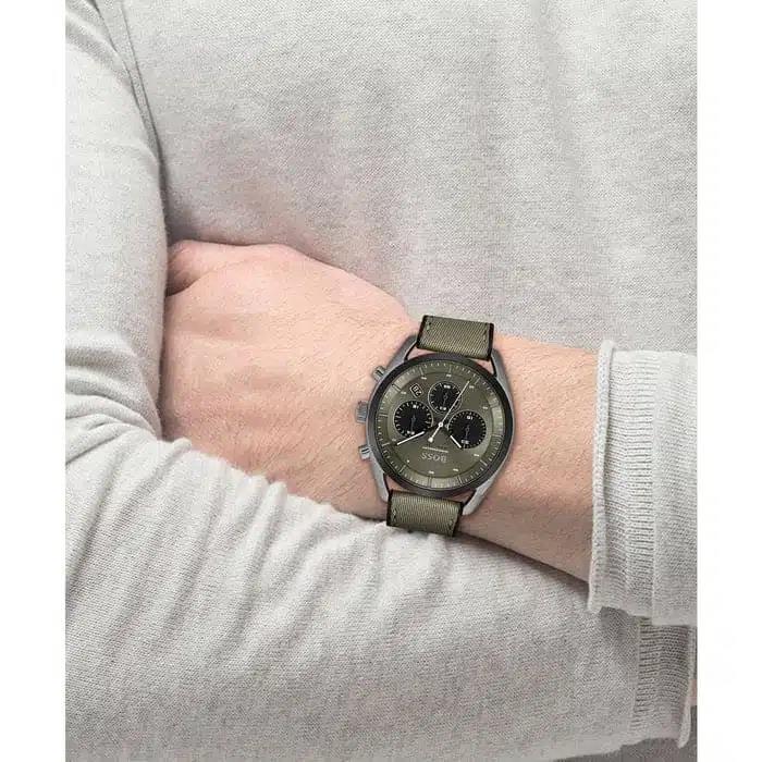 ساعت مچی مردانه هوگوباس Hugo Boss با طراحی روزانه بند مشکی سبز با قاب گرد دورنگ و صفحه دو رنگ با قابلیت کرنوگراف / روزوشب / تقویم و موتور ژاپنی با انرژی باتری و مقاوم در برابر آب تا عمق 100 متر به همراه گارانتی بین المللی