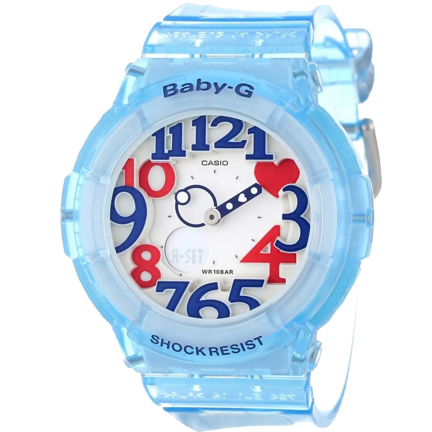 ساعت مچی زنانه کاسیو casio با طراحی روزانه بند سیلیکونی آبی با قاب گرد آبی و صفحه گرد سفید با قابلیت داشتن کرنوگراف ,تقویم ,روزهای هفته ,روز و شب ,زنگ هشدار ,دو زمانه ,ساعت کشورها ,ضد ضربه و موتور ژاپنی با انرژی باتری و مقاوم در برابر آب تا عمق 100 متر به همراه گارانتی بین المللی