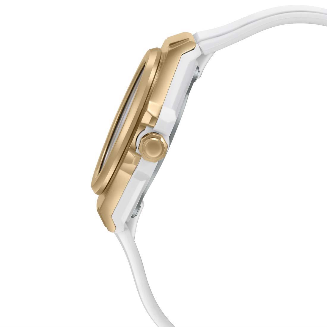 ساعت مچی زنانه کاسیو casio با طراحی روزانه بند سیلیکونی سفید با قاب فلزی طلایی و صفحه گرد سفید با قابلیت داشتن تقویم/ شبنما و موتور ژاپنی با انرژی خورشیدی و مقاوم در برابر آب تا عمق 100 متر به همراه گارانتی بین المللی