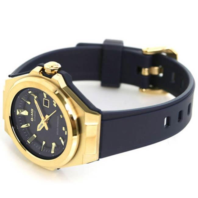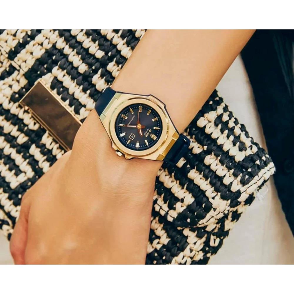 ساعت مچی زنانه کاسیو casio با طراحی روزانه بند سیلیکونی سرمه ای با قاب فلزی طلایی و صفحه گرد سرمه ای با قابلیت داشتن تقویم/ شبنما و موتور ژاپنی با انرژی خورشیدی و مقاوم در برابر آب تا عمق 100 متر به همراه گارانتی بین المللی