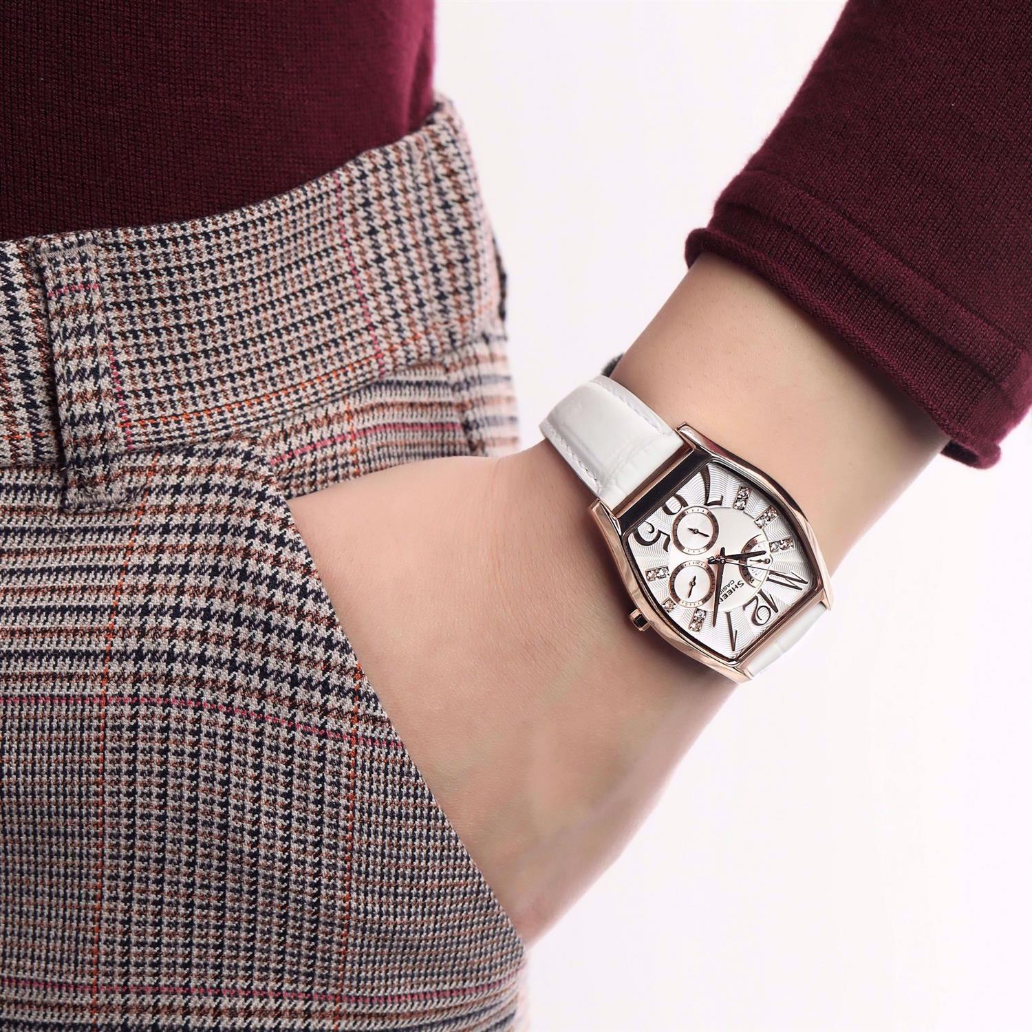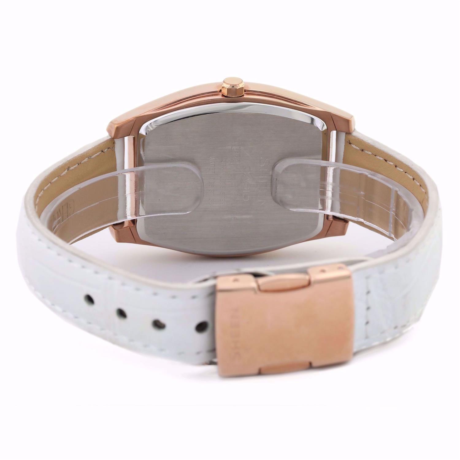 ساعت مچی زنانه کاسیو casio با طراحی روزانه بند چرمی سفید با قاب متفاوت مسی و صفحه نگین دار نقره ای و قابلیت داشتن تقویم,روزهای هفته روزوشب و موتور ژاپنی با انرژی باتری و مقاوم در برابر آب تا عمق 50 متر به همراه گارانتی بین المللی