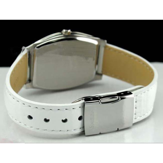 ساعت مچی زنانه کاسیو casio با طراحی روزانه بند چرمی سفید با قاب متفاوت استیل و صفحه نگین دار نقره ای و قابلیت داشتن تقویم,روزهای هفته روزوشب و موتور ژاپنی با انرژی باتری و مقاوم در برابر آب تا عمق 50 متر به همراه گارانتی بین المللی