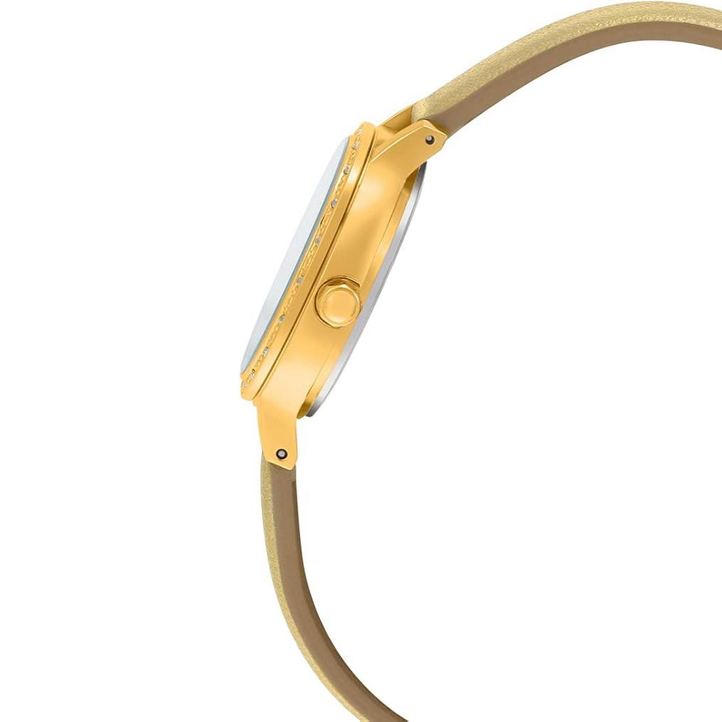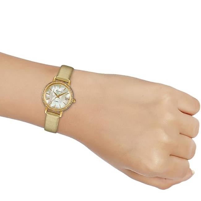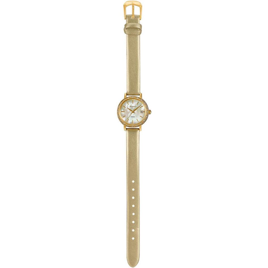 ساعت مچی زنانه کاسیو casio با طراحی روزانه بند چرمی طلایی با قاب نگین درا طلایی و صفحه گرد سفید صدفی با قابلیت داشتن تقویم و موتور ژاپنی با انرژی باتری و مقاوم در برابر آب تا عمق 50 متر به همراه گارانتی بین المللی