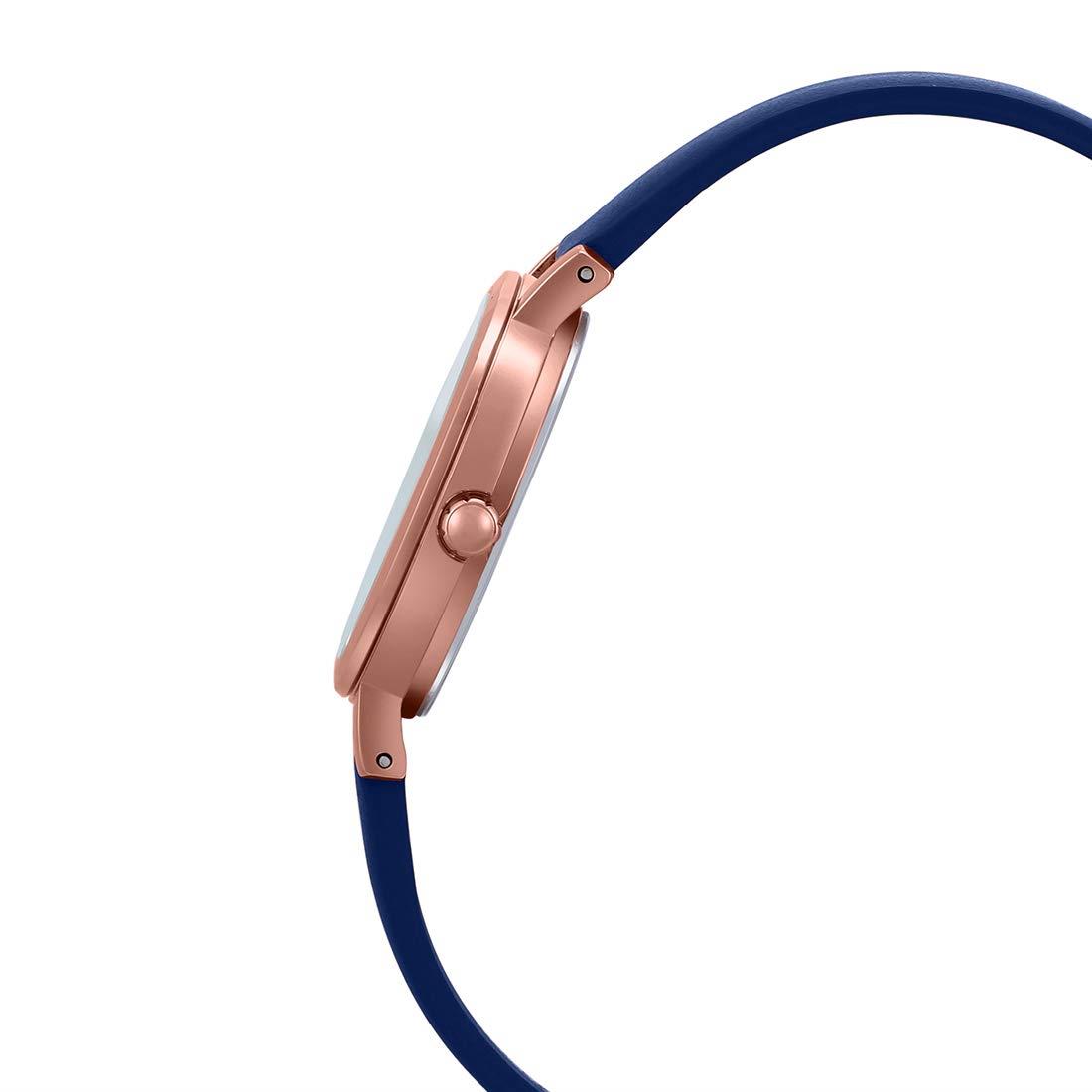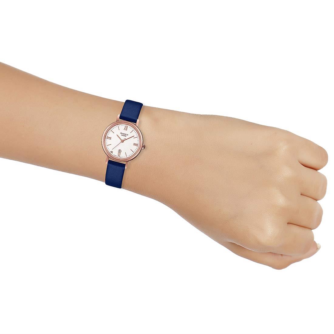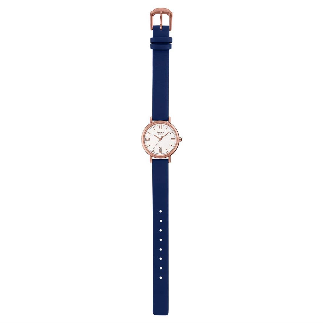ساعت مچی زنانه کاسیو casio با طراحی روزانه بند چرمی سرمه ای با قاب مسی و صفحه مزین به نگین سفید با قابلیت داشتن تقویم و شیشه ضد خراش و موتور ژاپنی با انرژی باتری و مقاوم در برابر آب تا عمق 50 متر به همراه گارانتی بین المللی